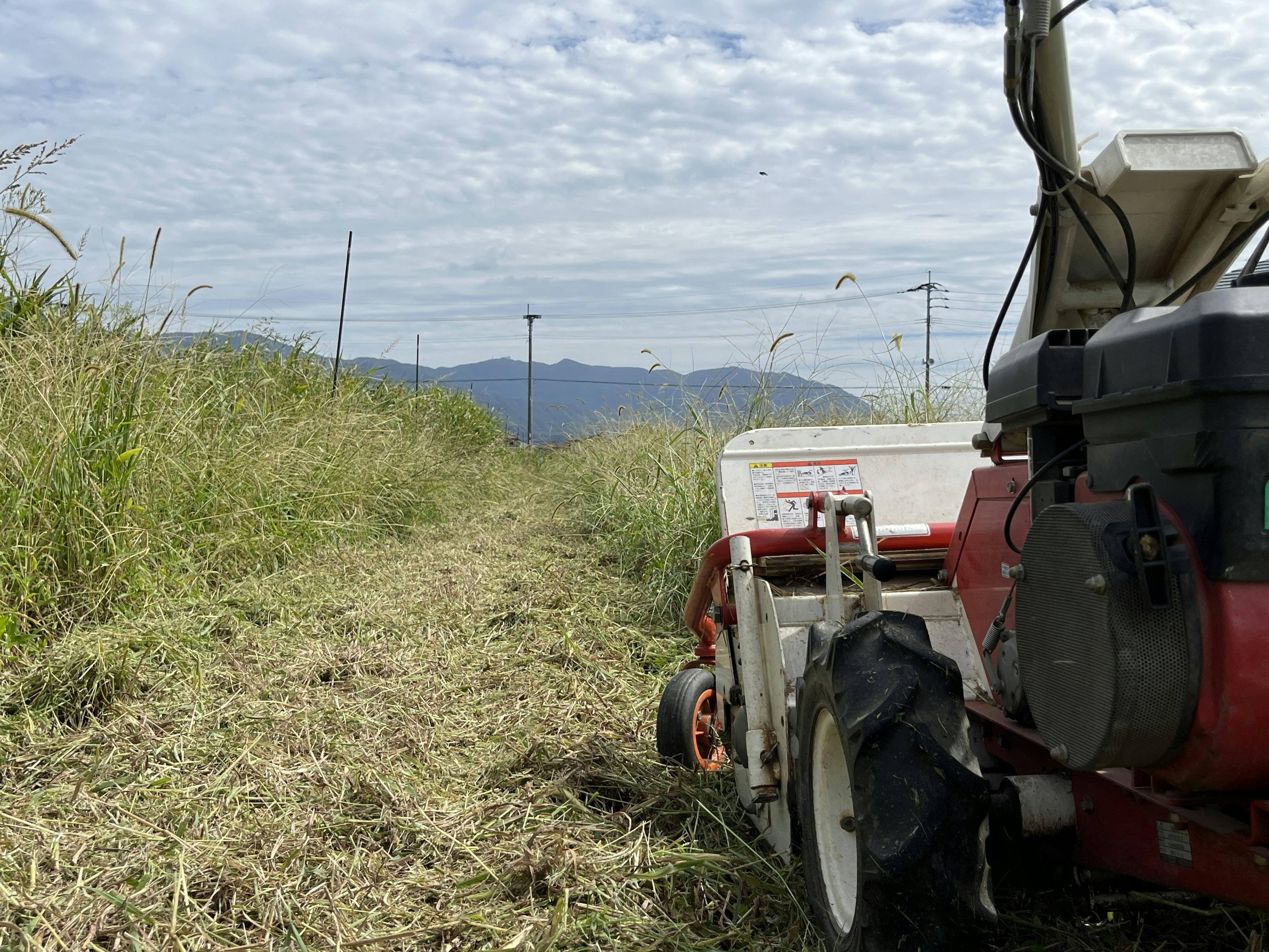 たくさんの伸びた草は機械をゆっくり走らせて細かく裁断していきます。数日で枯らせて土に混ぜていきます!