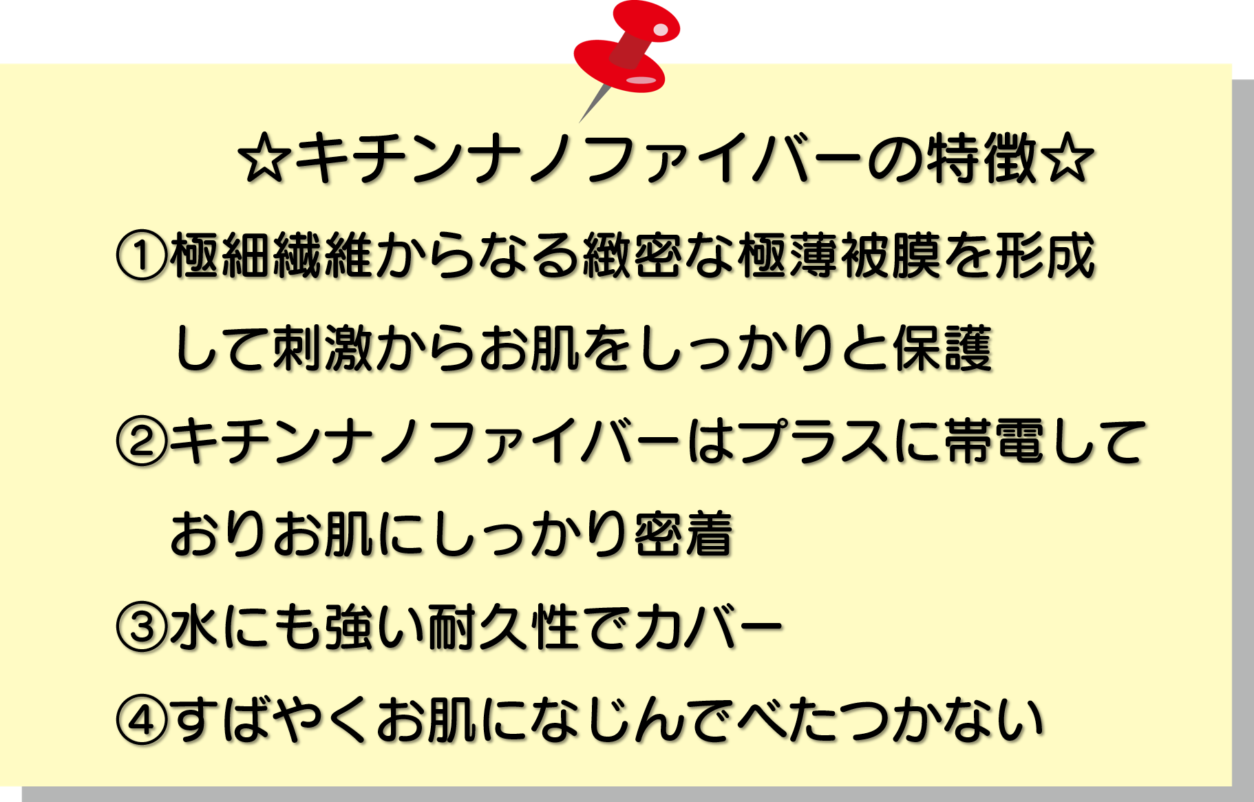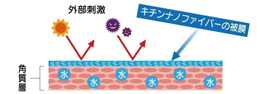 キチンナノファイバーの緻密な被膜に覆われることで、バリア機能が強化し、外部刺激からお肌を守りうるおいを保ちます。