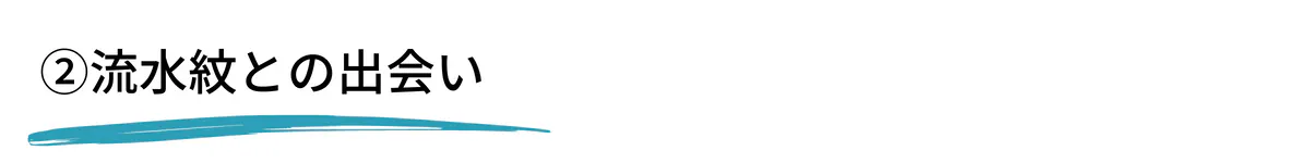 【流水紋】とは、川の湧き出る源流で、水の流れを読みながら墨を水面に落とし、そこに和紙で吸着するアート。