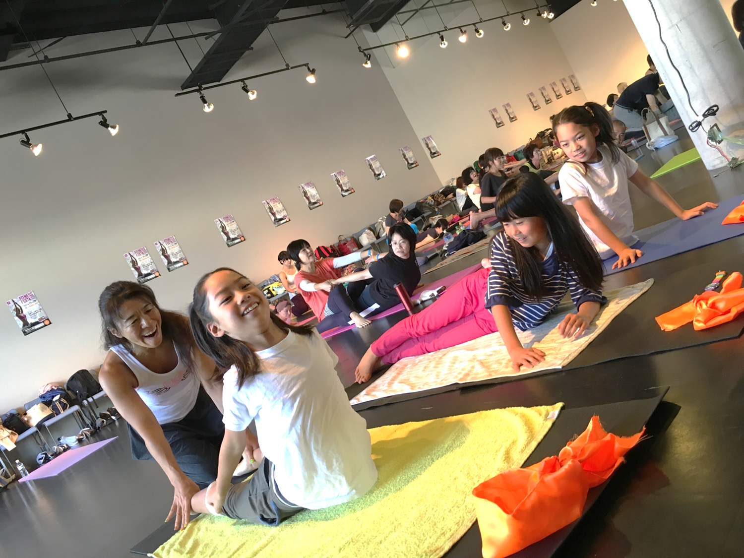 2会場目から、海風そよぐマリーナホップ広島で開催。大人に混じってヨガを受講する子供たちも。