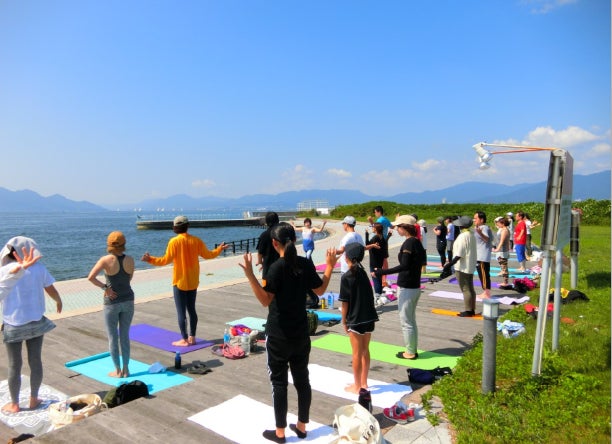 2会場目から、海風そよぐマリーナホップ広島で開催。大人に混じってヨガを受講する子供たちも。