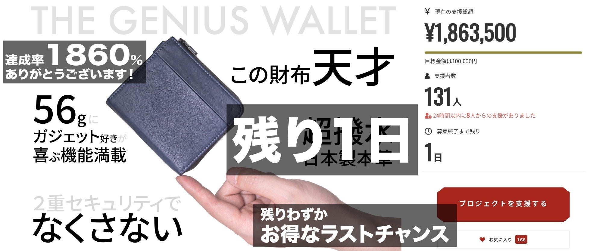 おかげさまで"残り1日"の段階で、131名様から『達成率:1863%』に相当するご支援をいただいております。