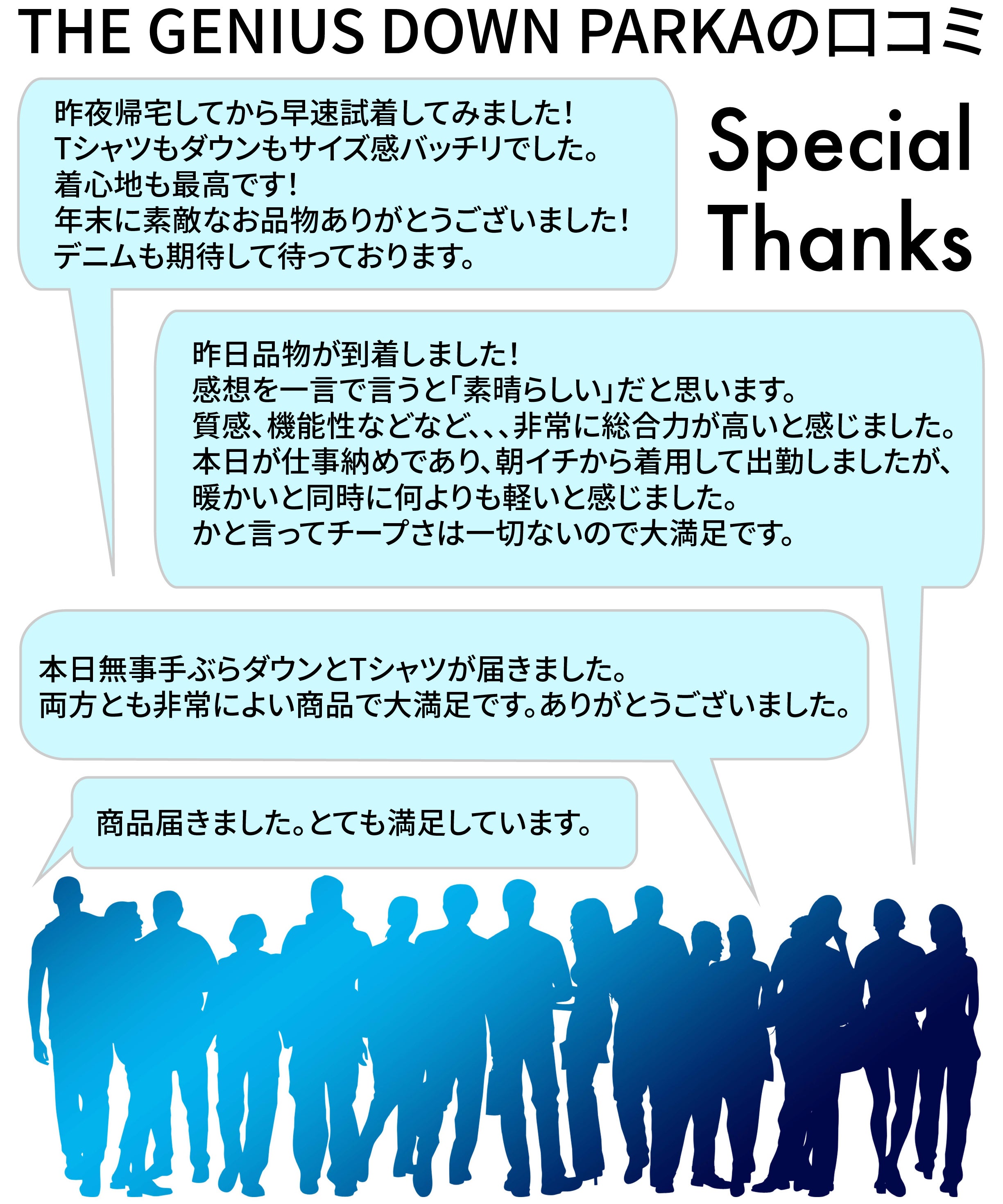 初回プロジェクト(Makuake様)で『究極の手ぶらダウン/THE GENIUS DOWN PARKA』をご購入いただいた方から嬉しいお声が多数届いております。