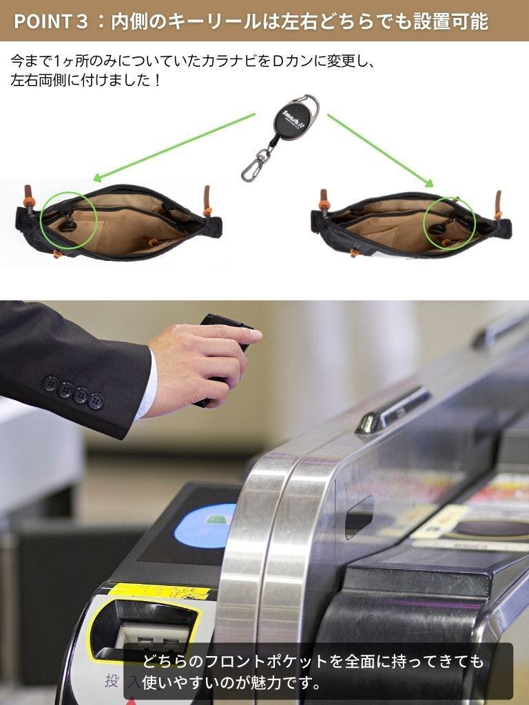 スマホポケットを従来品の位置から、2㎝右側へ移動させました。 こうすることでカバン全体のバランスが良くなり、さらに使いやすくなったんです。
