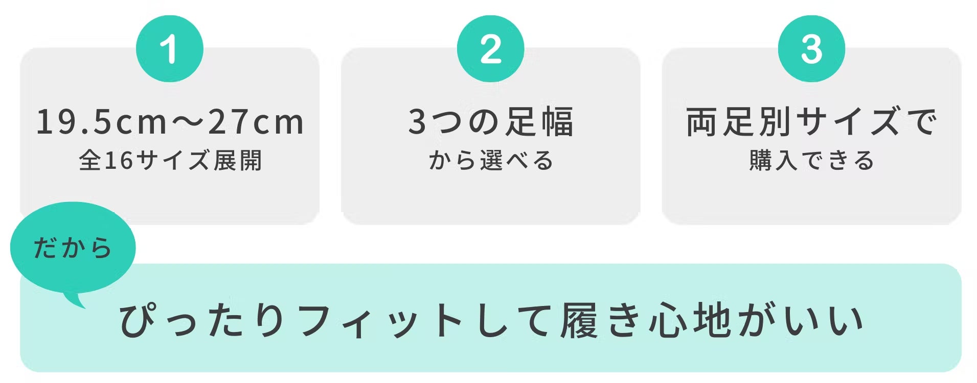 女性の足サイズのほぼ100%をカバーする、19.5cm~27cmの全16サイズをご用意。