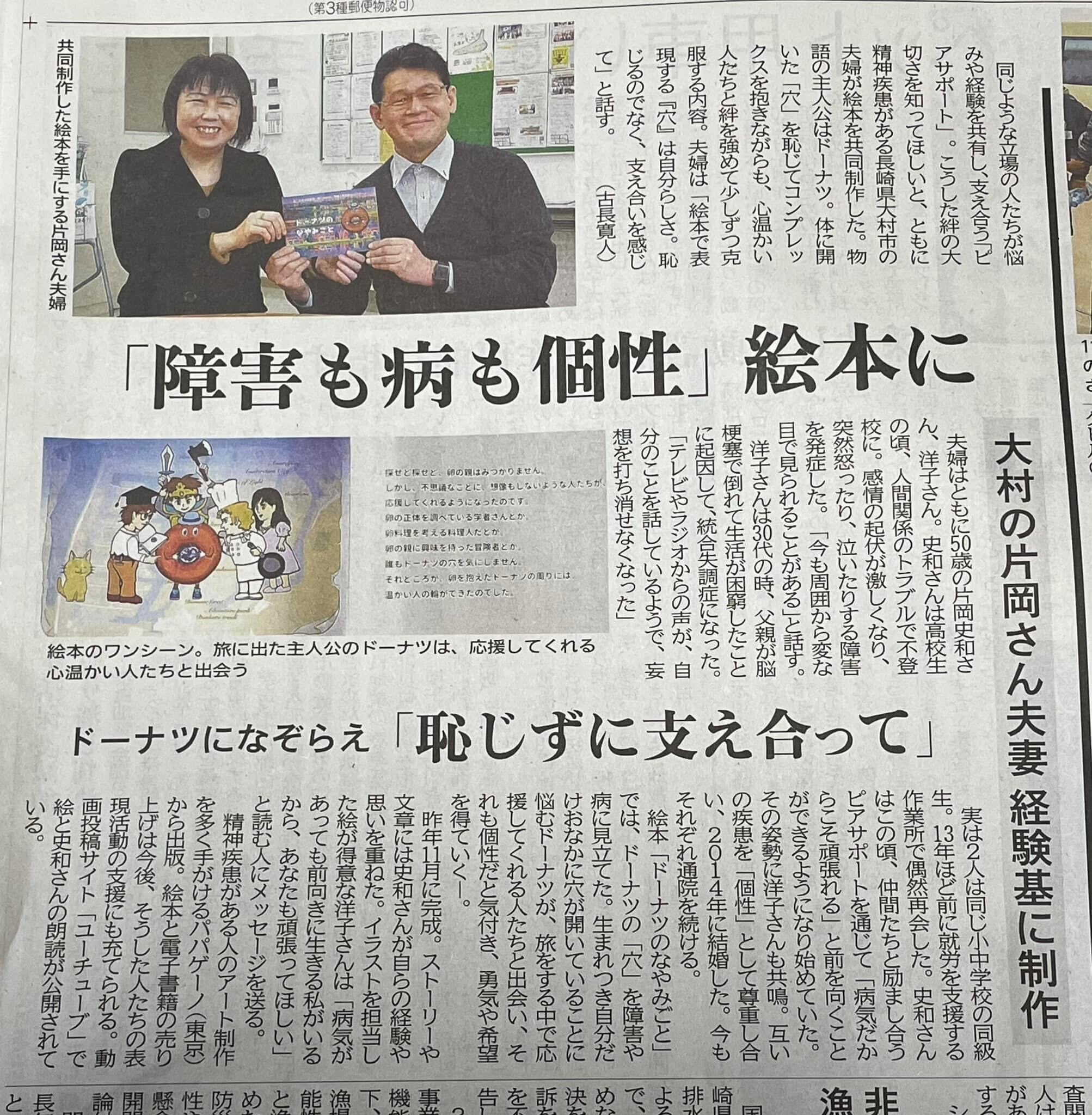 2023/04/12 11:40西日本新聞の2023年4月12日朝刊に、片岡夫婦のご活躍と絵本「ドーナツのなやみごと」について掲載いただきました。「障害も病も個性」絵本に 長崎・大村の夫婦「恥じるのではなく支え合いを」(※WEB版は有料会員限定記事になっています)ありがたいことに、早速書店様からもお問い合わせいただいております。これまで、医療機関、歯医者さん、福祉施設、教育機関、図書館などに絵本を置いていただいています。ご興味ある方は気軽にお問い合わせください。【絵本「ドーナツのなやみごと」のAmazonでの購入はこちら】https://amzn.to/3zQKJZH【パパゲーノに関するお問い合わせはこちら】https://papageno.co.jp/inquiry/ もっと見る