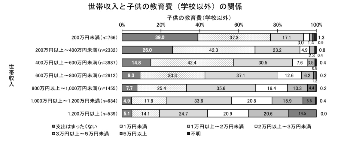 このグラフから、世帯収入が多いほど子どもの教育費(学校以外)は高くなっていることが分かります。