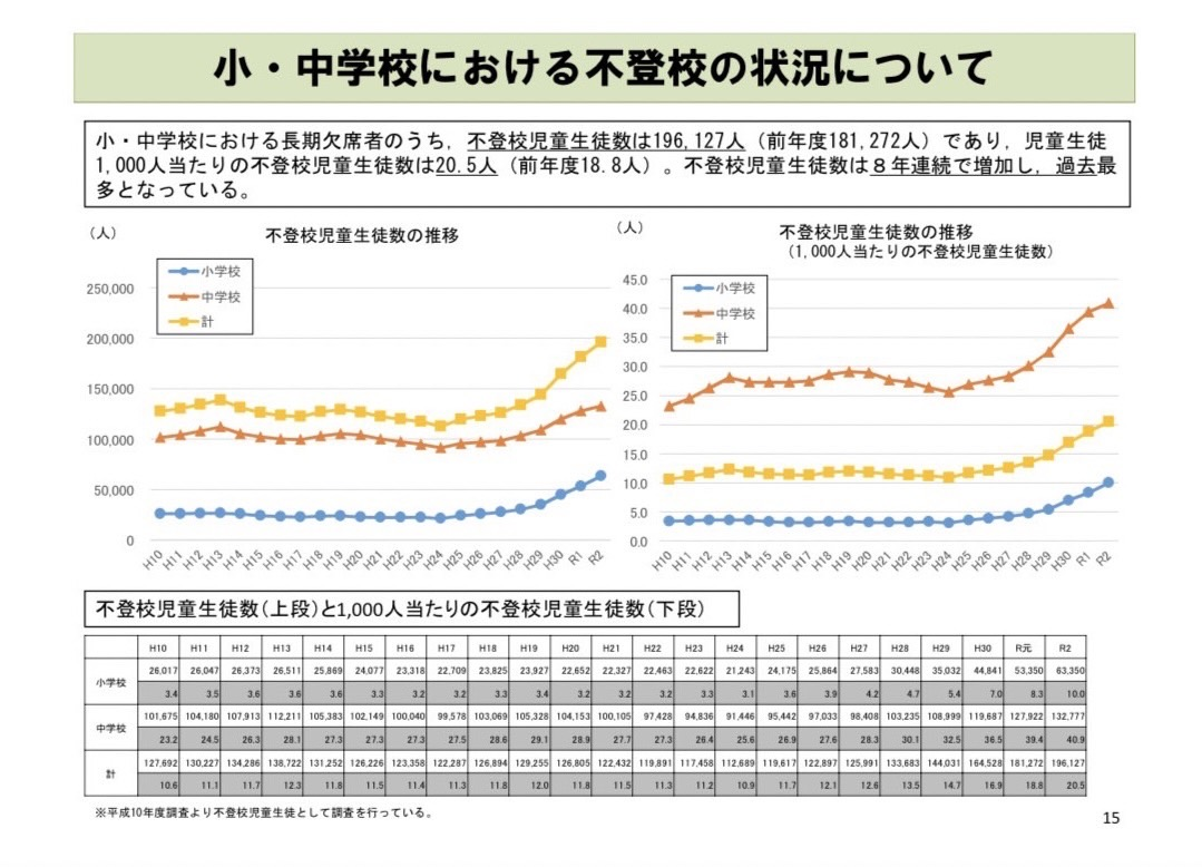 不登校の子どもの数は8年連続で増加しており、令和2年には小中学生合わせて19,6127人にものぼります。