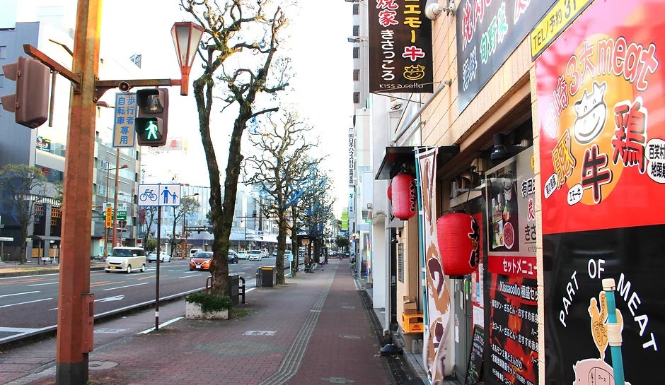 宮崎県の中心地のメインストリート「橘通」沿いに佇むお店です。ポップな外観とはうらはらに、お客様ごとにご準備する七輪で宮崎県を代表する「牛」・「豚」・「鶏」それぞれのブランド肉を最高の状態でご提供しています。
