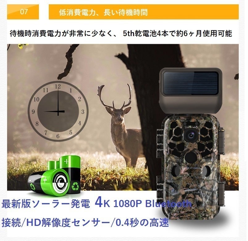 ・最新型 太陽光で永続動作 防犯カメラ 屋外 ソーラーパネル付き 防水 防塵 IP65対応 1080p対応 不可視光赤外線LED トレイルカメラ 監視カメラ 動体検知 人感センサー 夜間対応 ソーラー発電電池式 自動上書き録画