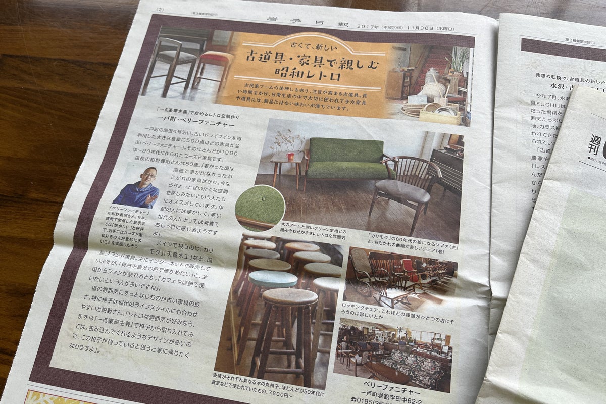 ※2017年11月30日(木)岩手日報の特集「古くて、新しい古道具・家具で親しむ昭和レトロ」