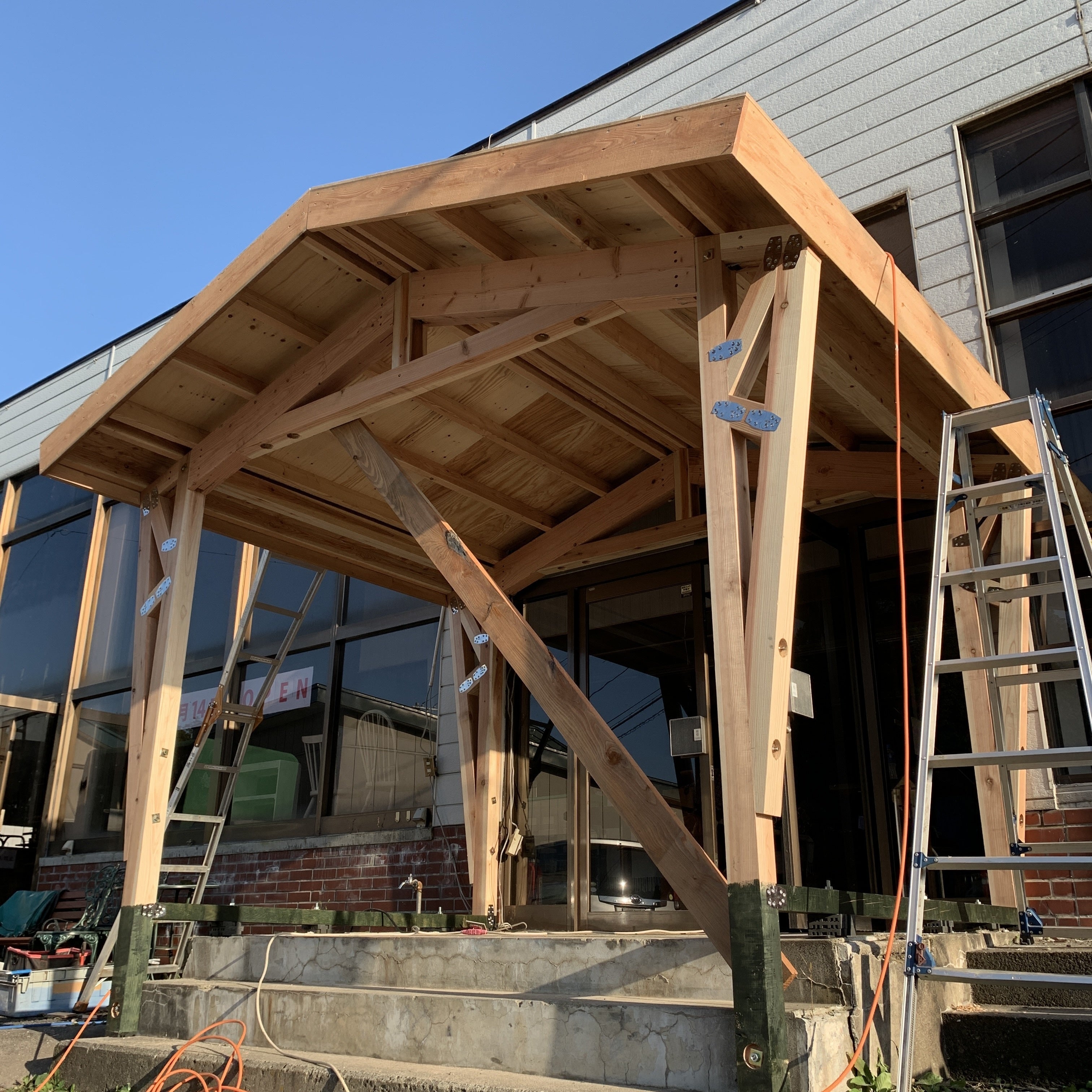 2022/09/30 21:42クラウドファンディンの挑戦は、本日9/30 23:59で受付は終了します。昨日「あっという間に」古いエントランスを解体工事が完了。いよいよ、店舗の顔であるエントランスの柱や屋根が出来てきました。今回のこのエントランス及び北欧コーナーの施工は、地元の柴田産業株式会社様にお願いしました。柴田産業様は、地元である岩手県一戸町に本社を構える企業で「岩手の山を元気にする木材屋」をコンセプトに「木」関わる様々な事業を展開中です。岩手県内の皆さんは、ご存知かもしれませんが地元ラジオでも有名です。柴田社長始め社員の方々も笑顔が素敵で元気な方ばかりです。いつも元気をもらっています。そして、何といっても「お洒落です。」なぜかというと、ユニフォームが何と「mont-bell(モンベル)」を着ています。驚きでした。そして、縁があり社長と話し企業の成り立ちや企業観や経営論なども話を聞くことができ、今回この活動記録の1番はじめに掲載させていただいた「鳥コ キッズステーション」の建物の工法である「ブーメラン工法」の話を聞きました。そして、社内で検討を重ねて今回のエントランスを「ミニブーメラン」にお願いをしました。検討している間にエントランスは、やめようかとも検討しましたが、エントランスは、店舗の大事な顔です。私共は、エントランスを通っていただいて店内に入っていただきます。お客様に天然木でつくったエントランスの中で「木」を感じていただき、店内に入っていただきたい。そして、私共でセレクトした本物の家具をゆっくり体感していただきたいと考えています。この工法のネーミングも気に入りました。「ブーメラン」は、戻ってきます。お客様にまた戻ってきて欲しい。店舗経営をしている方には、最高だと感じました。そして、BERRY-KAGUも「鳥コ キッズステーション」 さんも、実は、国道4号線沿い。私は、以前の仕事で良く行った那須高原のあの道を思い出しました。近い将来、「ブーメラン」屋根の店舗が4号線沿いにできたなら「これって、町おこしになるかも」と、夢が広がったのです。そんな、エントランスが間もなく完成します。ご期待ください。ライフスタイルショップBERRY-KAGUの挑戦は、まだまだ続きます。 もっと見る内装工事の経過報告です。レジの後ろになる壁面のクロスが概ね完成しそうです。