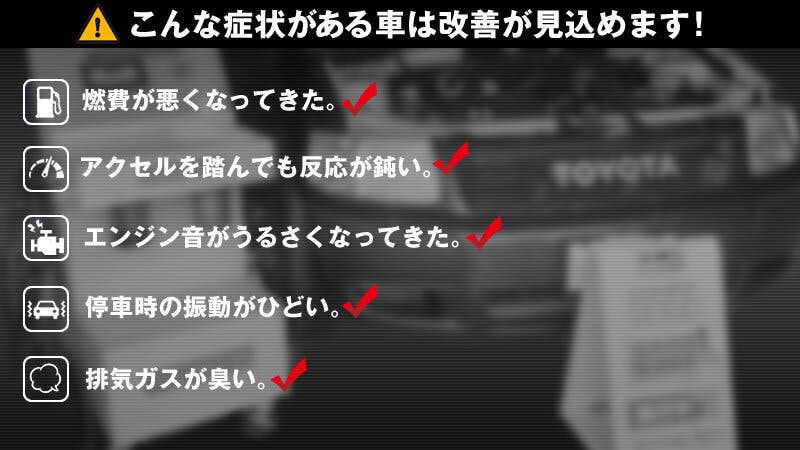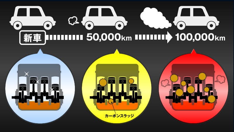 車は走れば走るほど、エンジン内部の汚れが溜まります。汚れが溜まるとエンジンオイルの流れが悪くなり、エンジン本体がスムーズに回転しなくなり【始動・加速性が悪くなる】【エンジン音が煩くなる】等の症状が発生し、様々な不具合の誘発に繋がります。