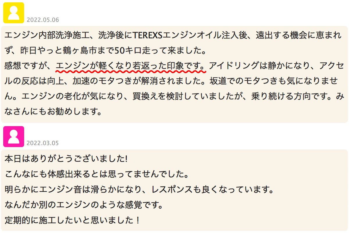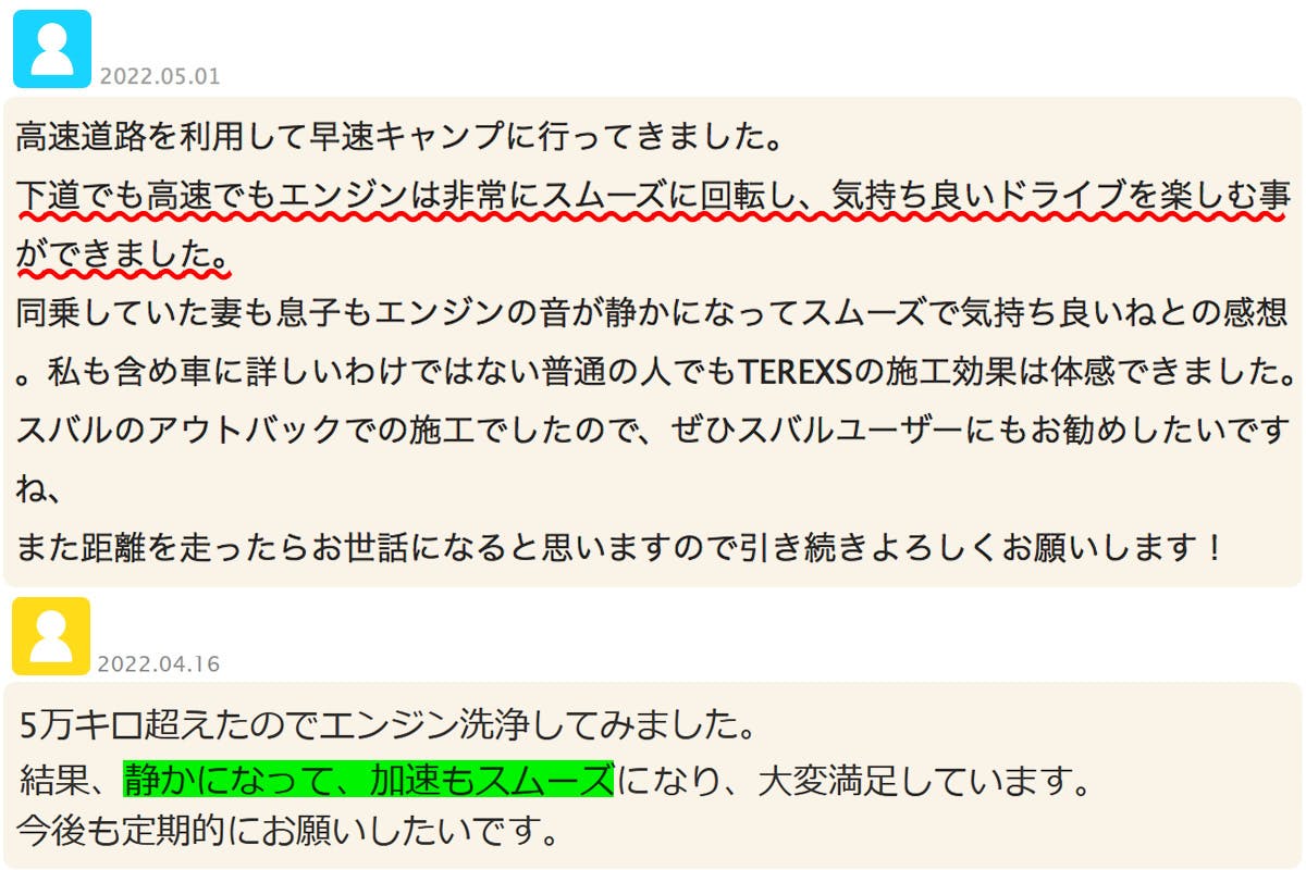 現在まで多数の車両にTEREXS施工を実施し、全てのオーナー様に効果を体感頂けました。