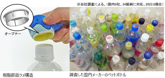 流通しているペットボトルのキャップを参考に、何度も形状を修正・試行錯誤して軽く開けられる形を設計しました。 キャップの形によって、オープナーが滑ってしまう心配もなく、国内メーカーのペットボトルキャップに対応しています。