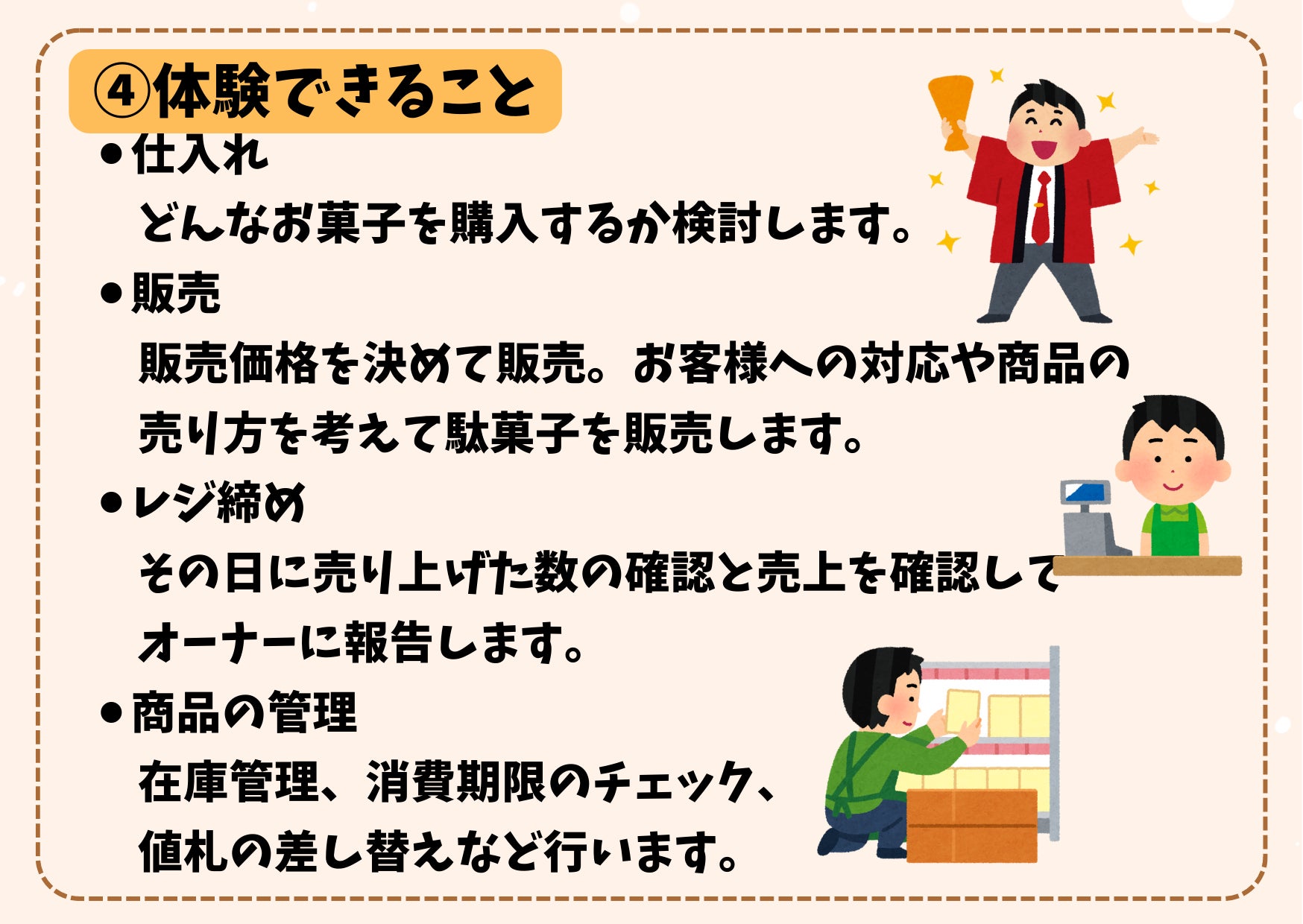 ただお仕事を体験をしてもらうだけではなく、商売の仕組みやルールを学んでもらうことで、自分の頭でしっかりと理解しながら体験することができます。