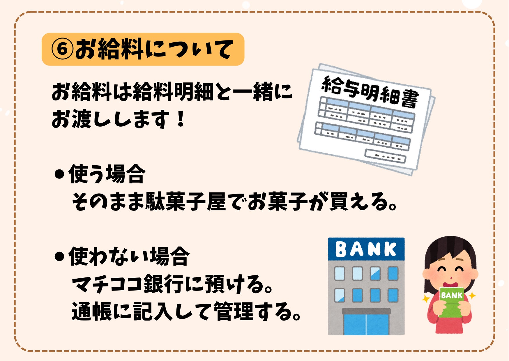お給料についても、よりリアルにお金の扱い方を学んでもらえるように仕組みを考えました。自分で働いて稼いだお金だからこそ、大事に使い方を考えるとともに、お金の大切さを理解できます。