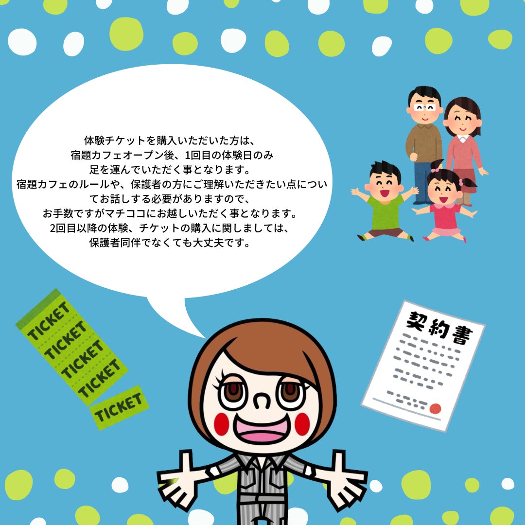 体験チケットを購入いただいた保護者の方には、実際に1回目のチケット利用日にマチココにお越しいただく必要がございます。