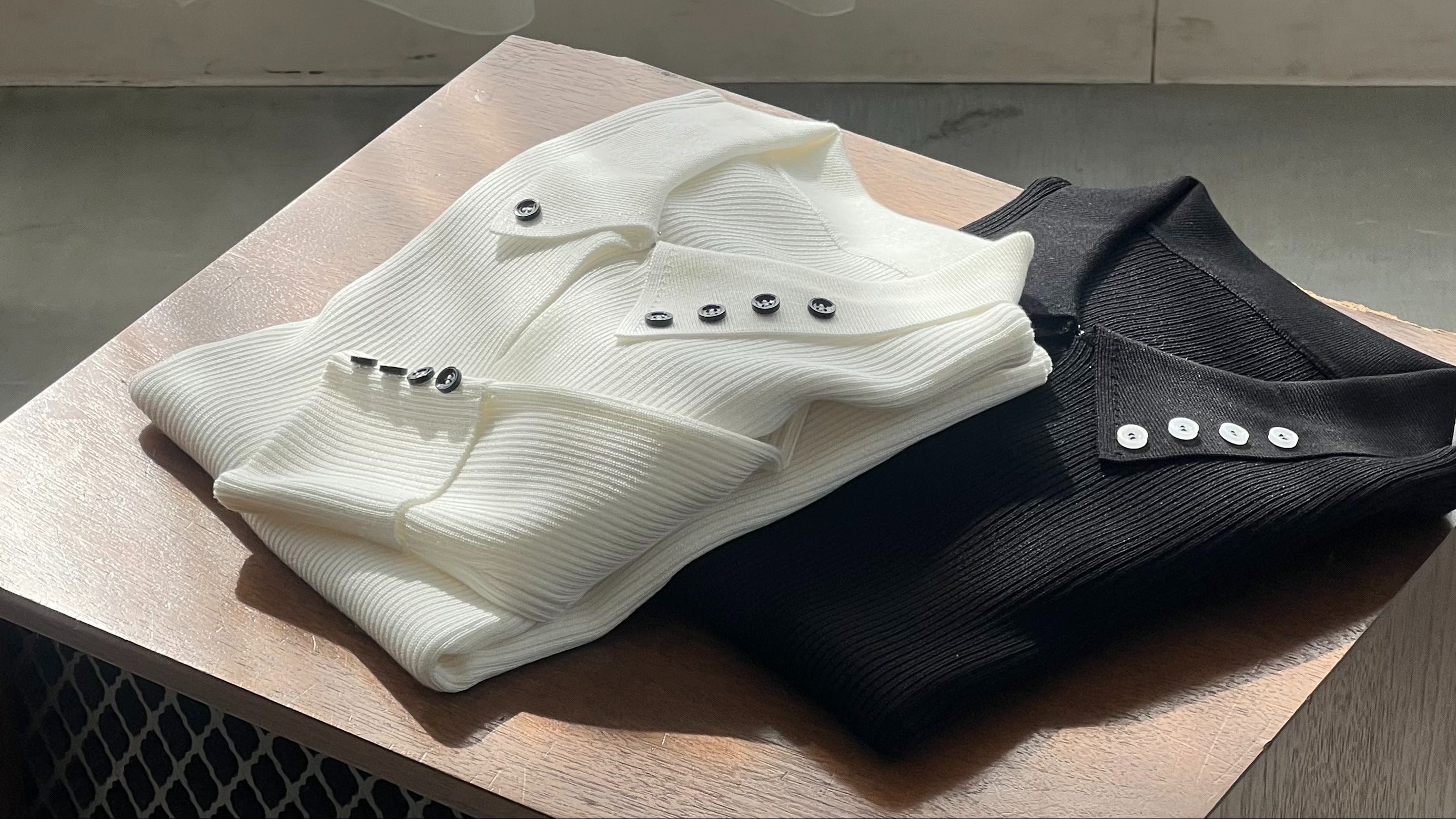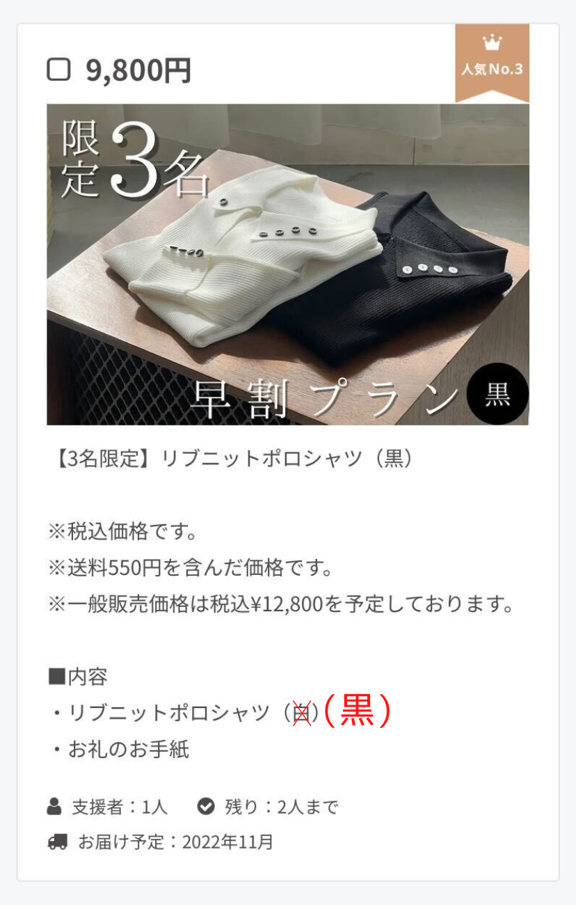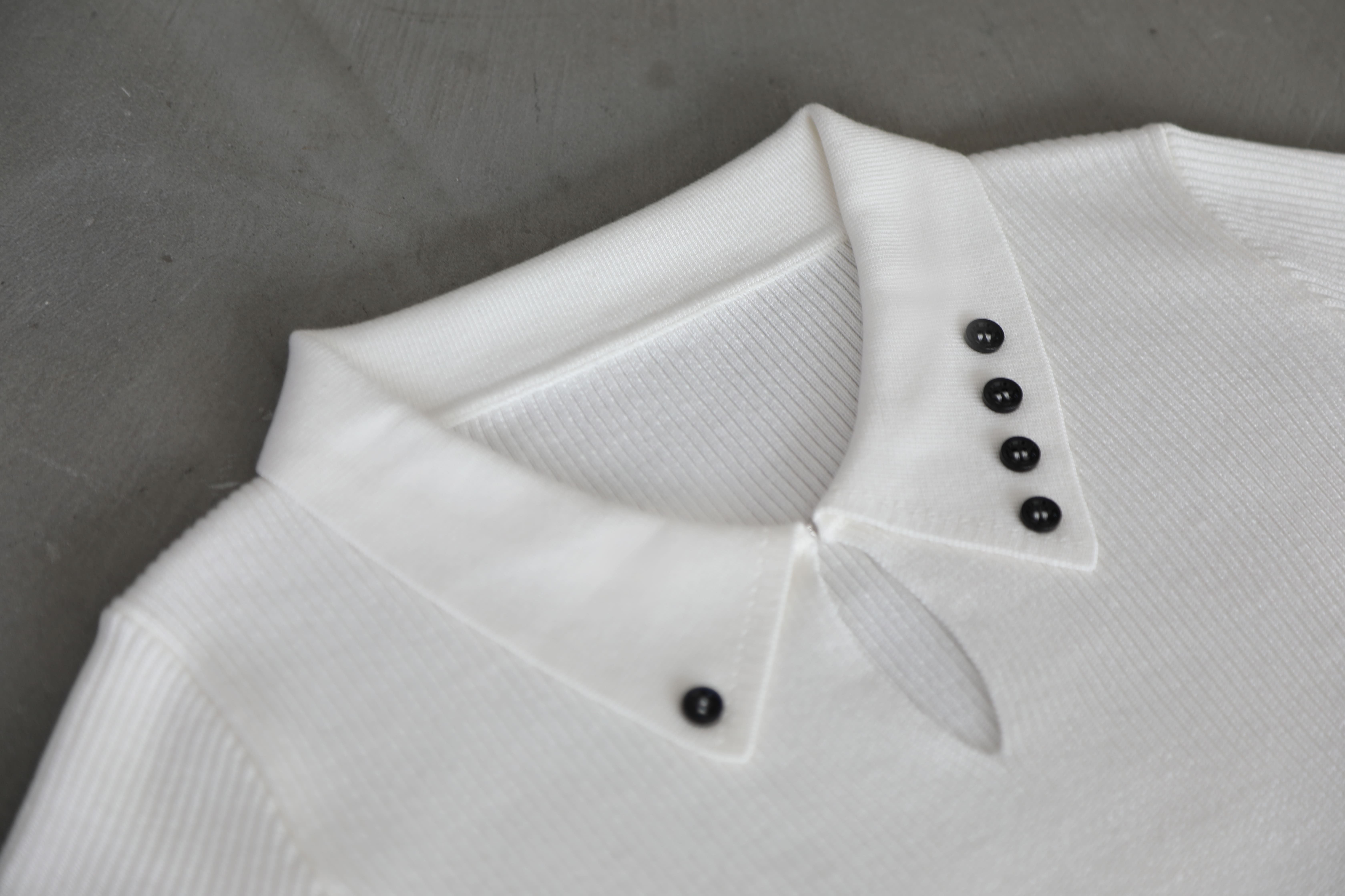 【お知らせ】リブニットポロシャツ(黒)のリターンについて、内容にはリブニットポロシャツ(白)と記載がございますが、(黒)をお届けさせていただきます。宜しくお願い申し上げます。