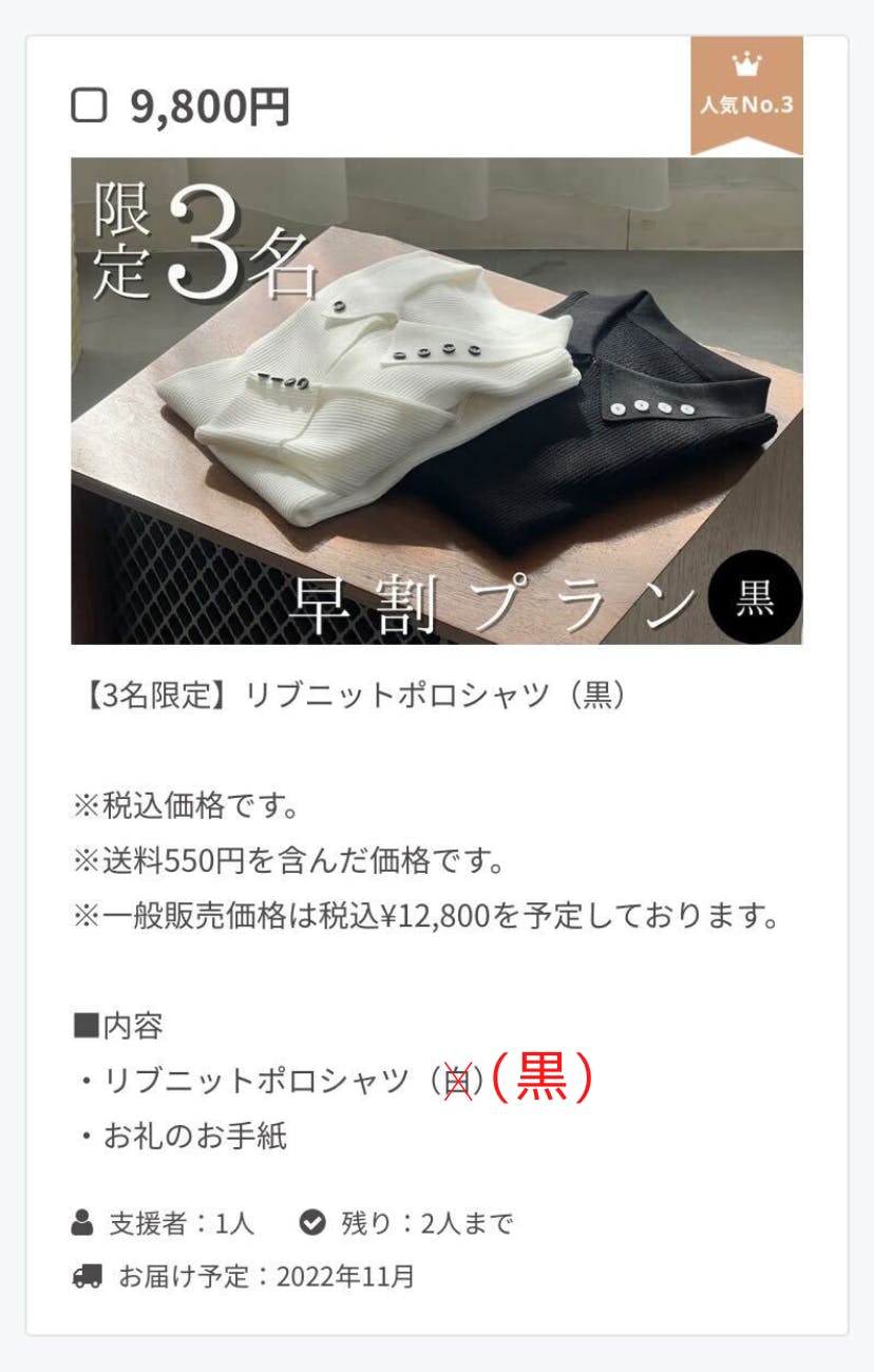 リブニットポロシャツ(黒)のリターンについて、内容には(白)と記載がございますが、実際には(黒)をお届けいたします。