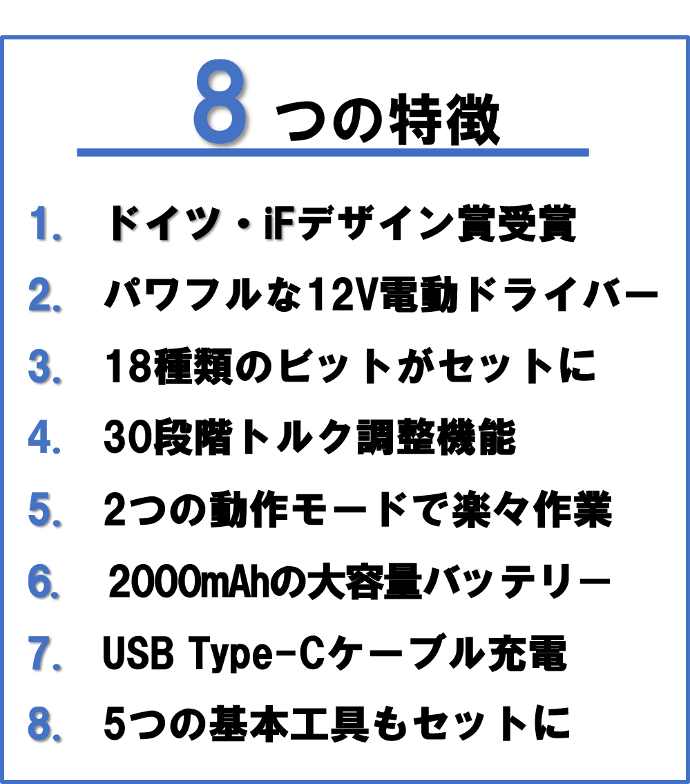 ・8種類の丈夫で錆に強いS2合金製ビットが付属