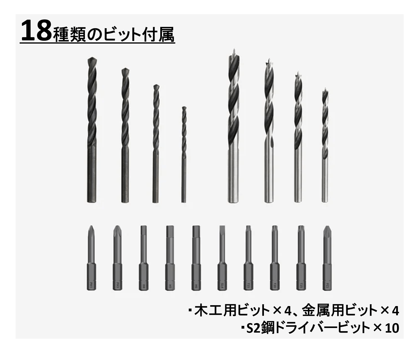 “HOTO SET PRO” には18種類のビットが付属しているため、穴あけとネジ締めといった様々なシーンに対応可能です。