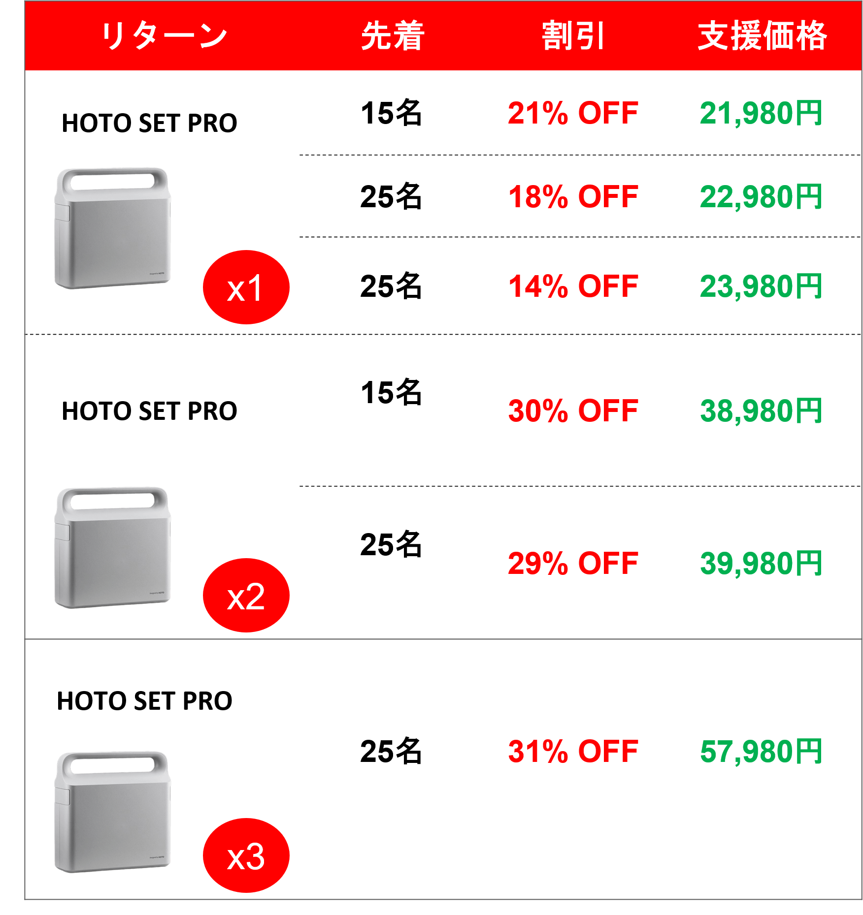 2022/12/16 00:12支援者の皆様、 BRIGHT サポートチームです。お世話になっております。プロジェクト 開始から41日で 34人もの支援者の方々よりご支援を頂き、無事プロジェクト終了を迎えることが出来ました。早速皆様のリターンを2023年01月中にお届けできるよう準備を始めております!皆様にご満足いただけるリターンをお届けできるよう、全力で取り組んで参りますので引き続き、【HOTO SET PRO】 をよろしくお願い致します。BRIGHTサポートチーム もっと見る
