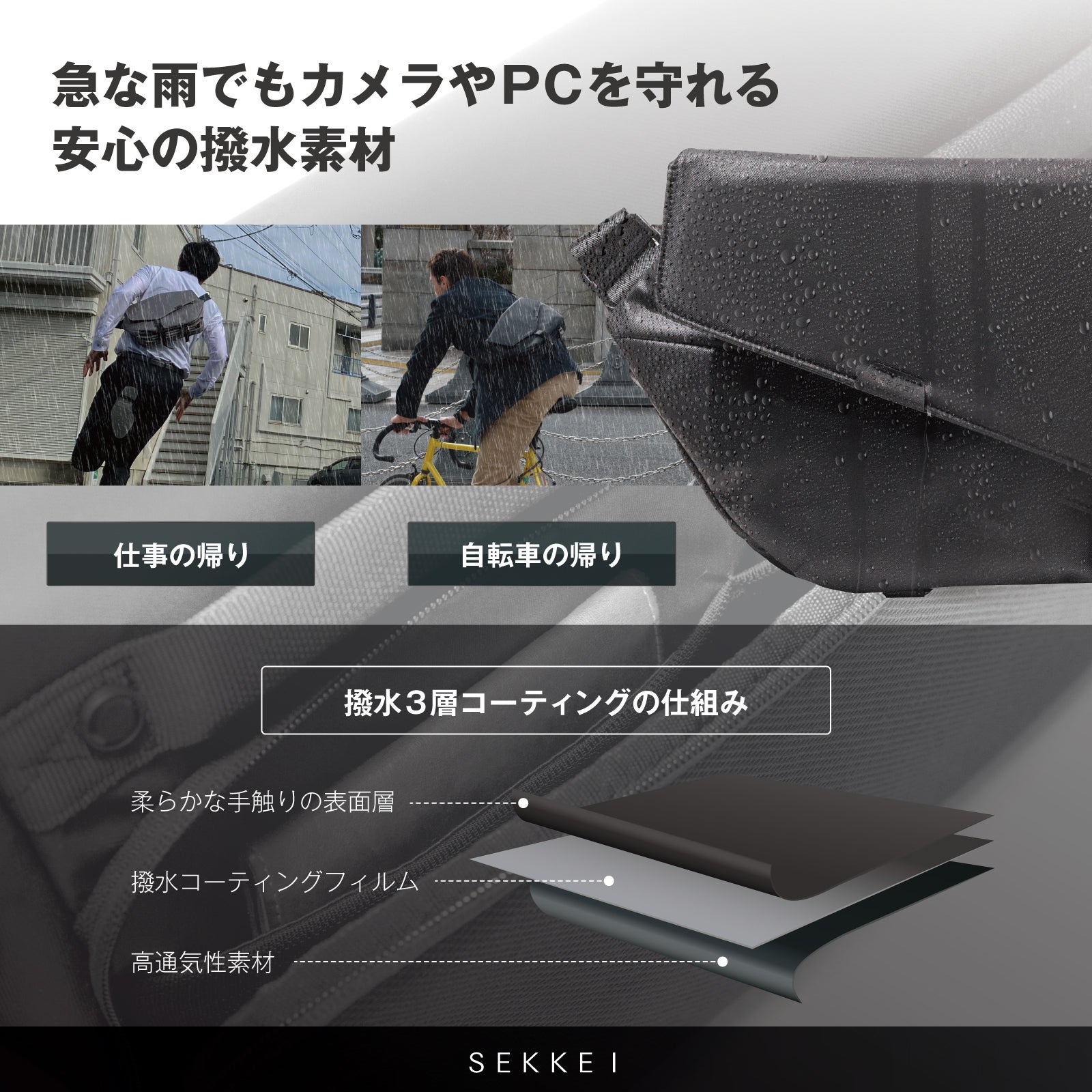 大切な書類やPCを守るため、撥水加工された生地を採用。