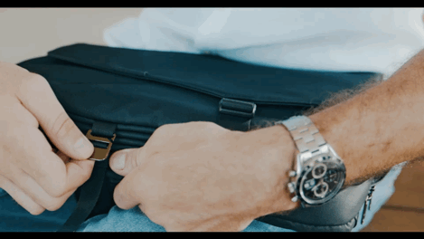 マグネットでカチッと止まって外れないバックル。スタイリッシュかつ機能的。