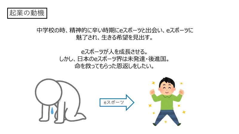 eスポーツをもっといろんな人に知ってもらうことで、僕の中学生だった時のような、人生が辛い人、生きがいがない人、eスポーツ仲間がいない人に、「eスポーツ楽しい!」、「もっと生きていたい!」そう思ってもらえるような環境を作りたいと思い、起業を決意しました。