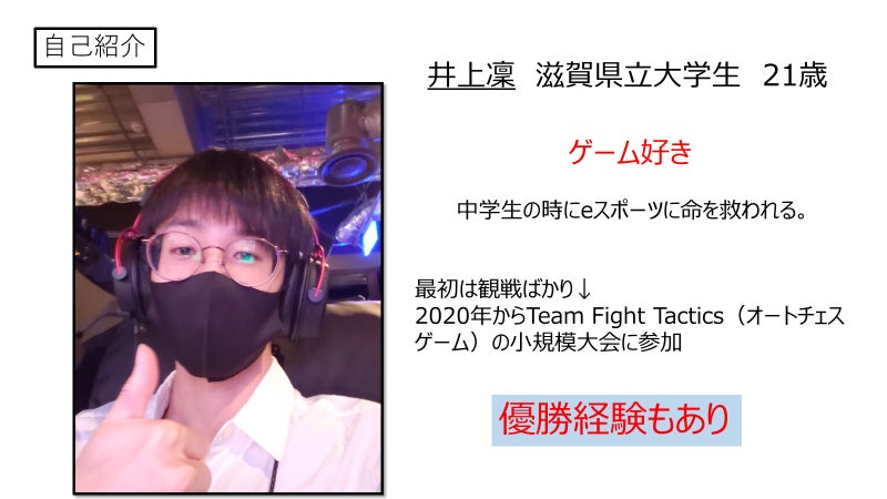 さらに、滋賀県立大学に入り、「Team Fight Tactics」というeスポーツにハマり、コミュニティー大会にも出場するようになり、一度優勝もすることができました。大会に勝つために研究し、どうしたら相手に勝てるのか、自分が強くなれるのかなどを自主的に探ったりすることから、eスポーツには人を成長させる可能性があることに気づき、より一層eスポーツの魅力に惹かれていきました。