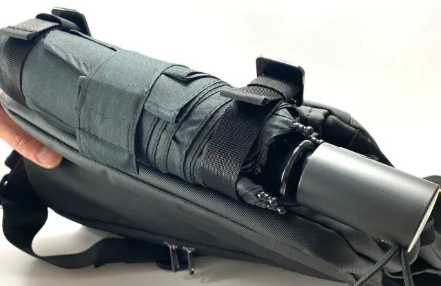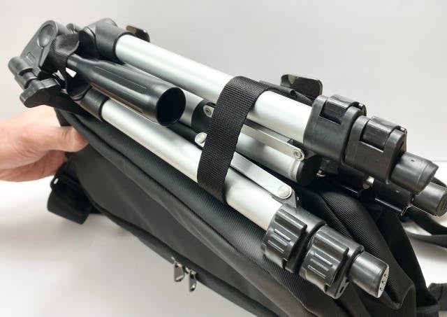 背面のベルトで三脚や折りたたみ傘などの長物を収納できます。