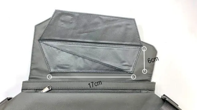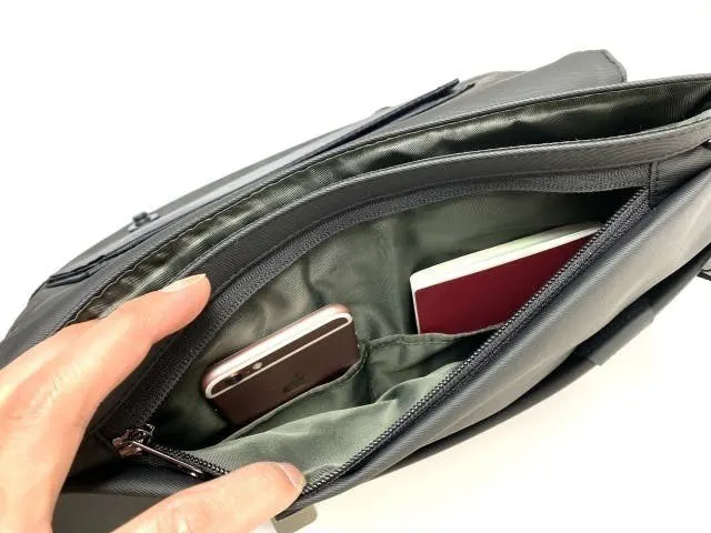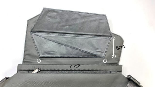 バッグの背面には、ジッパー付きのコンパートメントがあります。中を開けると小ポケットが2つ付いています。銀行通帳を横にして、パスポートを縦に収納可能です。縦13cm 横 29cm でB6サイズまで収納可能です。