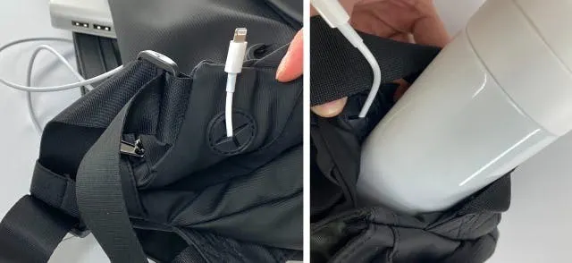 モバイルバッテリーを収納すれば、専用のケーブル穴を通して、通話をしながら充電することも可能です。
