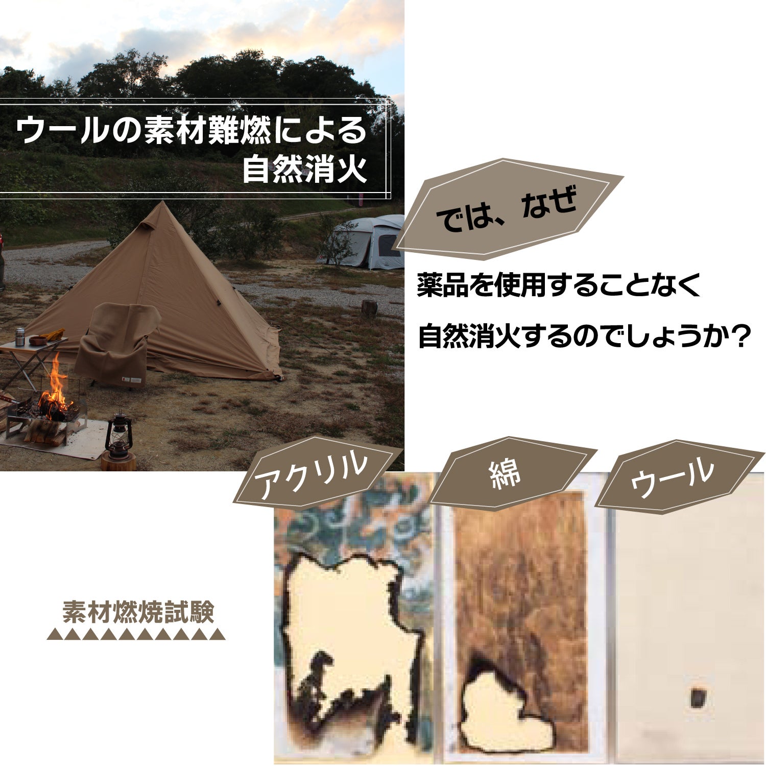ウールは繊維の中に窒素や水分を多く含んでいるから、火が付いても自然に消化し燃え広がりません。