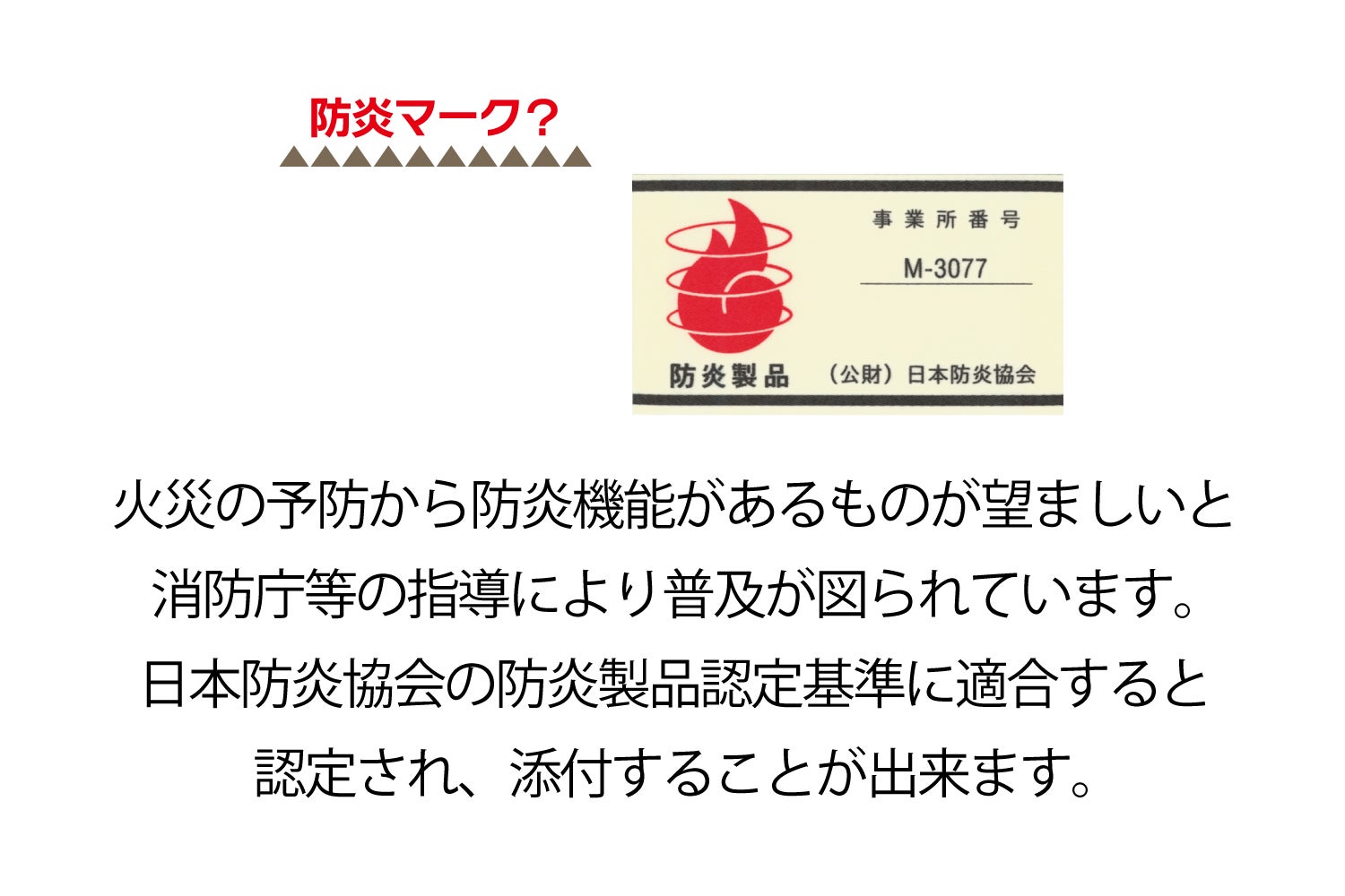 A:防炎とは燃えにくい事象のことを意味しています。小さな火源(火だね:マッチ・ライター) を接しても炎が当たった部分が焦げるだけで容易に着火せず、着火しても自己消火性(自ら延焼拡大を停止する性能)により、容易に燃え広がることはありません。