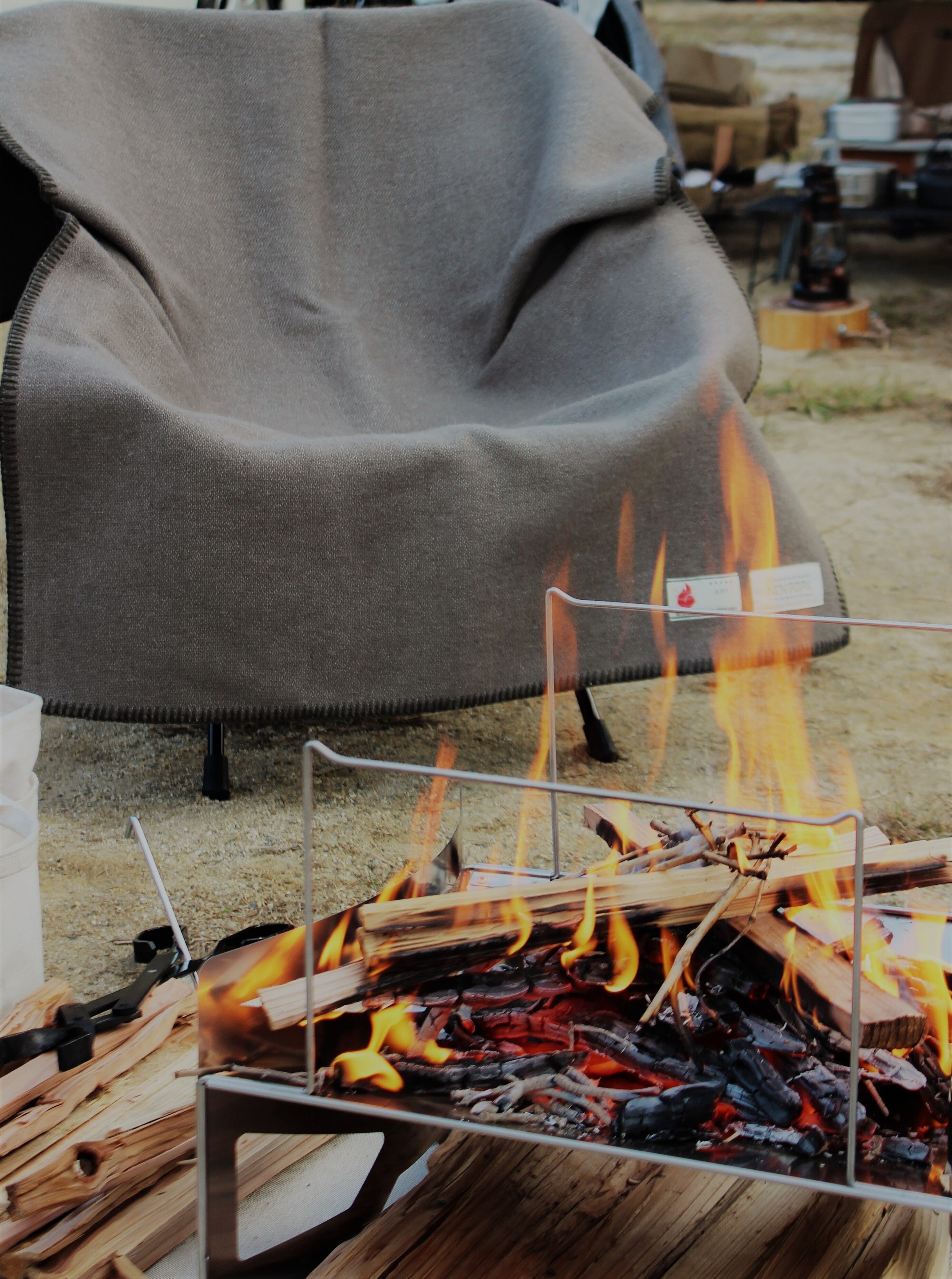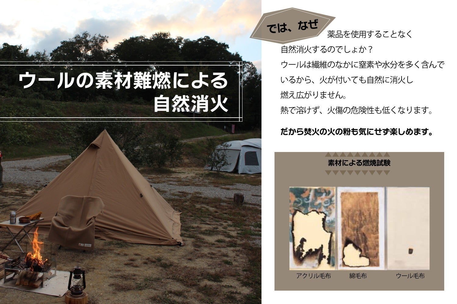 広い空の下で解放感を感じているであろう時に、そんな事を気にしないとダメなのか~…。と、思うと同時に「会社のウール毛布(ニッケ毛布)持って行けば問題ないんじゃ…」とサンプルで実験してみるとやはり火の粉が飛んでも穴は開かない。横には羨ましがる友人。。。