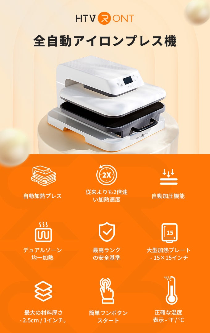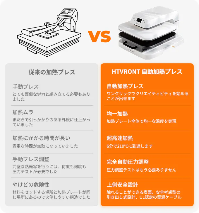 HTVRONTは、全ての人にとって熱転写をより簡単かつ安全にする為に作られ、開発に重点を置き、均一な加熱、簡単な自動加熱プレス、自動加圧機能等の最先端技術を開発しました。これらのブレークスルー技術により、今までの加熱時間が長く、熱転写の結果が悪く、加熱性能が均一では無い、他の加熱プレス機とは一線を画しています。