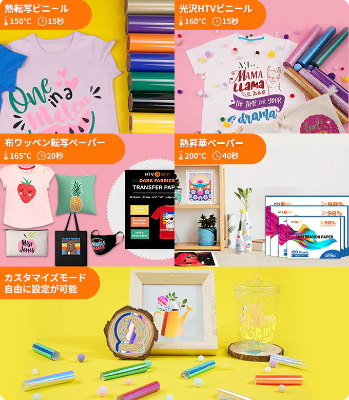 アイロンプリント初心者や、効率的な生産を行いたい方向けに、HTVRONTは6つのクイックモードが使用可能です!