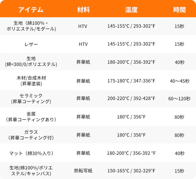 様々なプロジェクトの推奨温度と時間については、以下の表を参照してください。