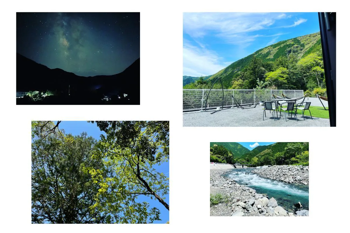 小鳥たちのおしゃべりが始まった、と思うと、お日様が顔を出し、種々の緑に反射した優しい光に里が包まれていきます。集落の真ん中を流れる畑山川の音や葉擦れの音、小鳥たちの鳴き声が心地よく耳に入ります。静けさが増した夕暮れからは庭のハンモックで、ゆらり、ゆらり。満月の夜は、ほんわかとした月明かりを楽しみ、新月になれば、自分の手のひらさえも見えない闇夜に浮かぶ、あまたの輝きに宇宙への興味がわき、流れる星に見惚れます。