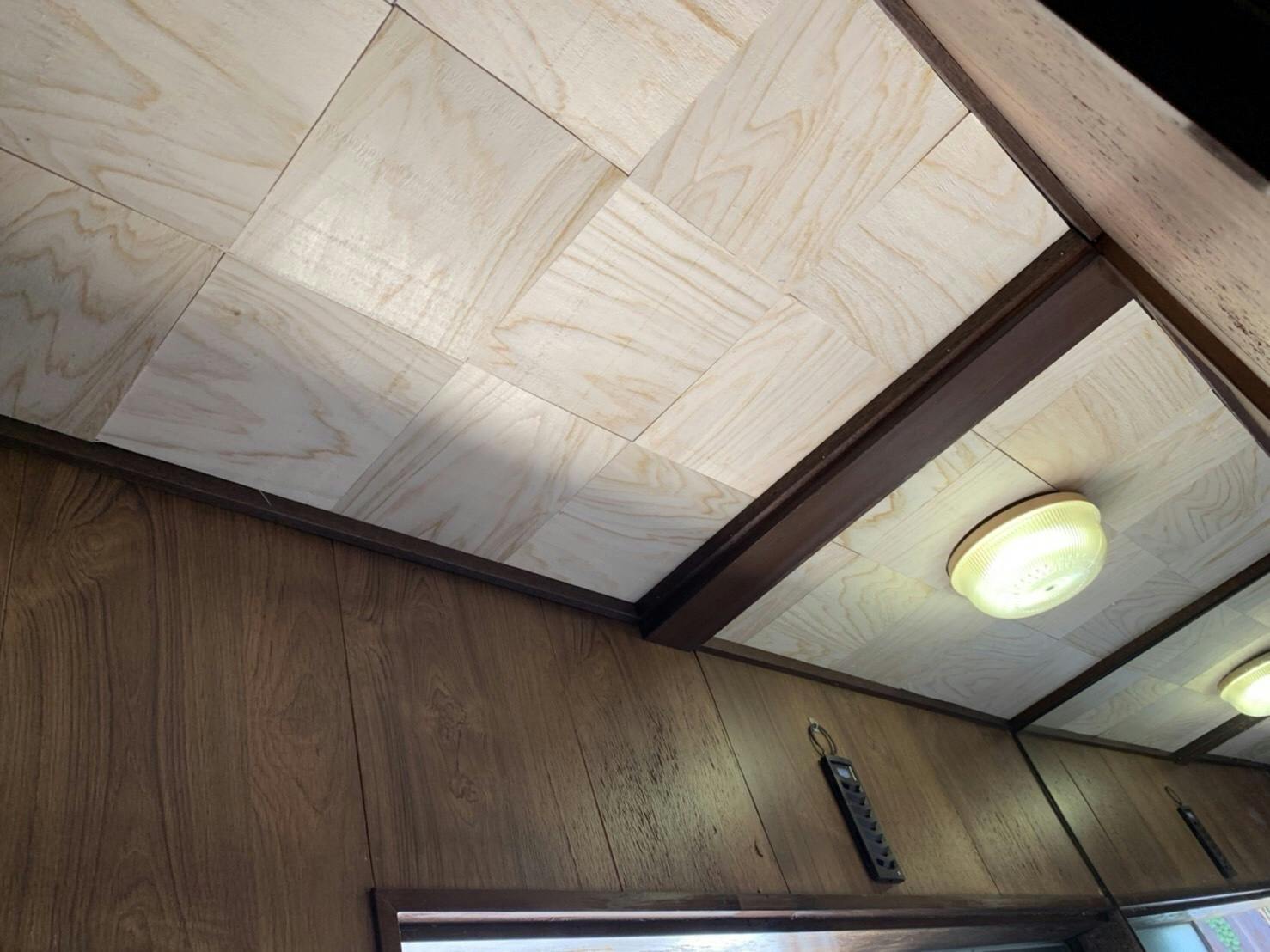 そのため、富山県木材研究所から提供していただいた木シートを用いてトイレ天井の補修を行いました。