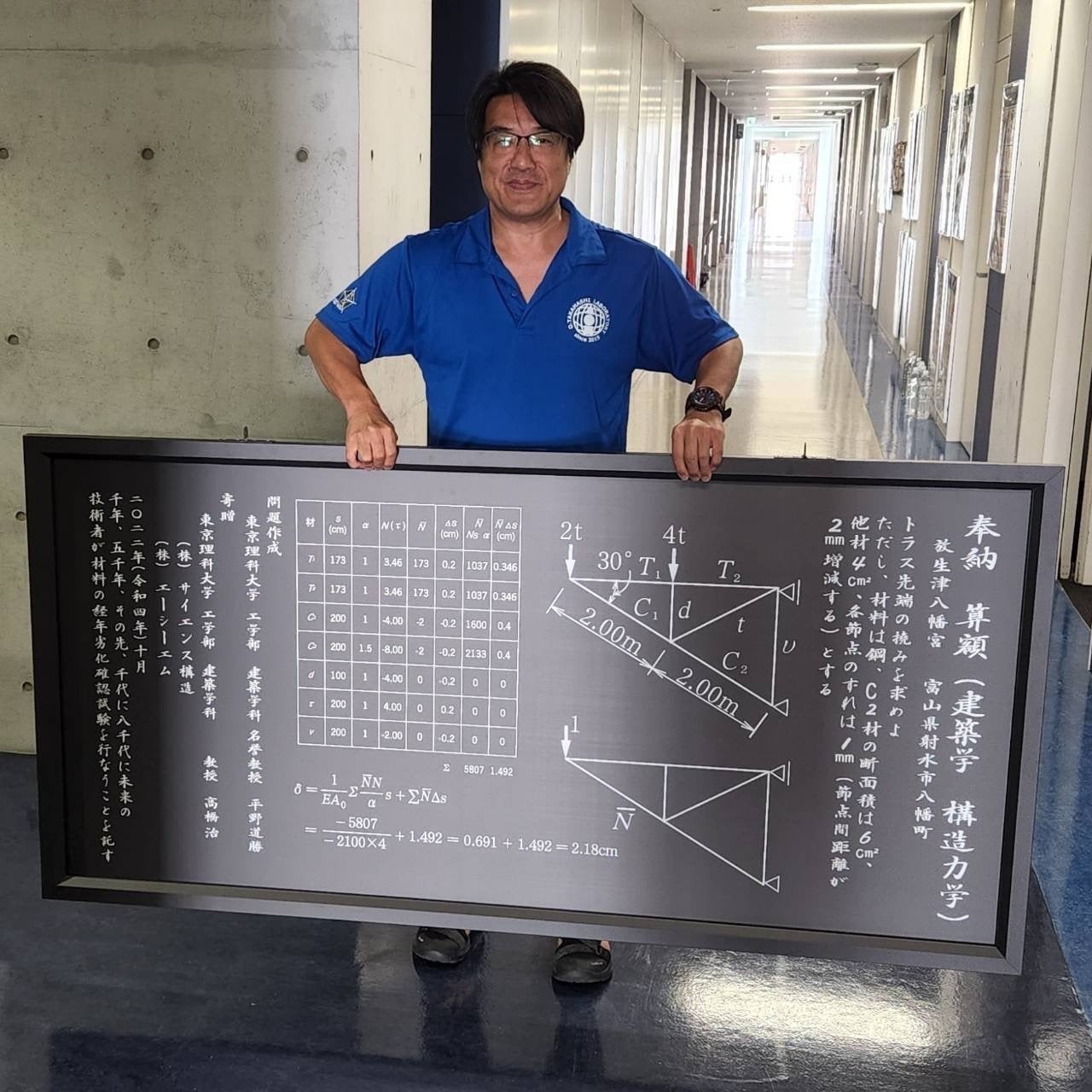 この度、東京理科大学建築学科教授高橋治氏が放生津八幡宮に算額絵馬を奉納する運びとなりました。高橋教授は、新素材として注目される炭素繊維の研究にも造詣が深く、炭素繊維によって製作された算額絵馬を奉納します。併せて、炭素繊維素材の特色や建築素材への活用等について講演致します。