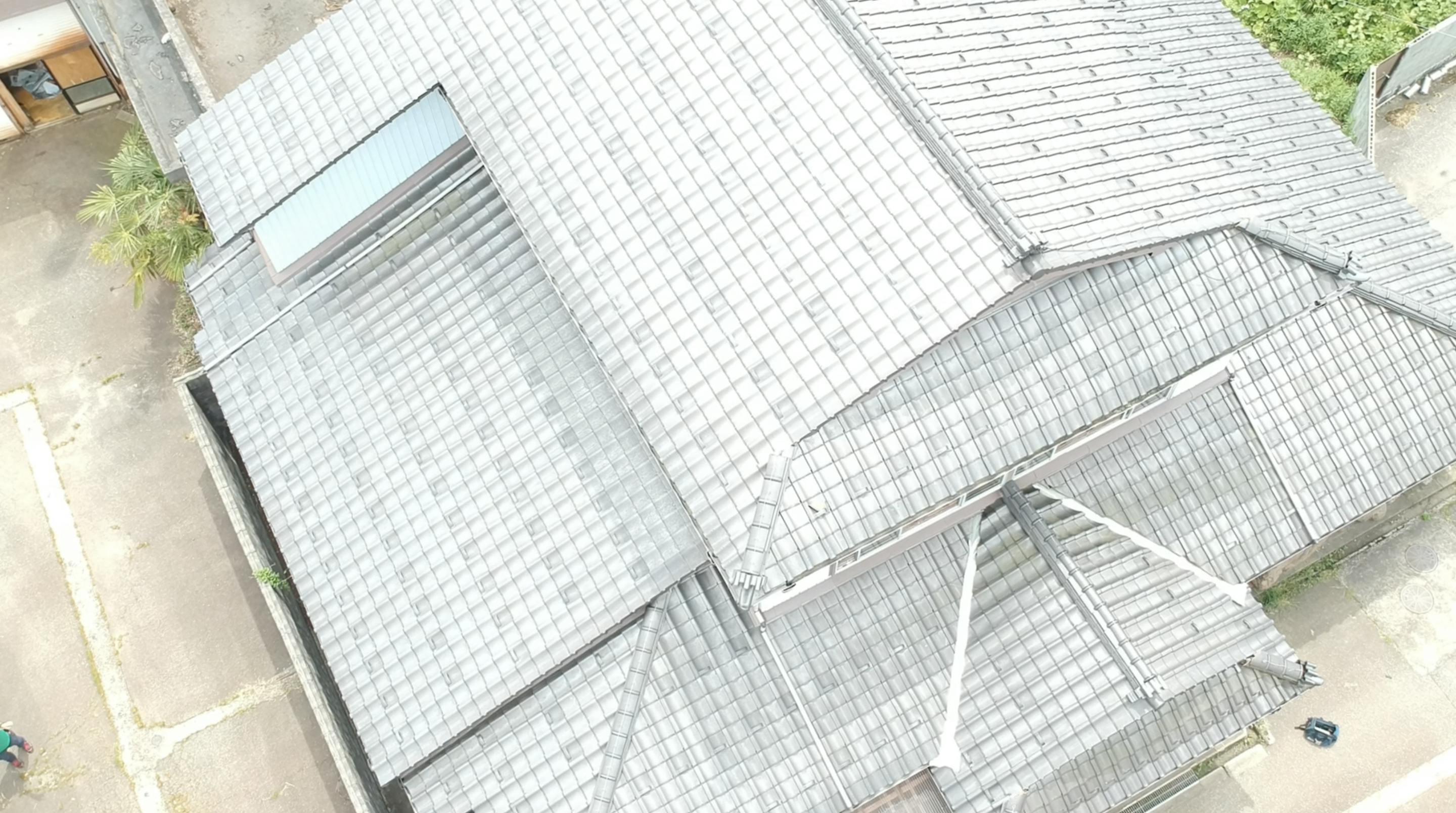 屋根に登っての確認には危険が伴います。そのため、ドローンを用いて建物の屋根を撮影し、瓦の破損状況やズレを確認しました。