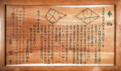 放生津八幡宮に奉納されている石黒信由の算額は、一見の価値が有ります。販売されている絵馬も秀逸です。(放生津八幡宮は旧荒屋鉱泉のすぐ近くにある神社です。)
