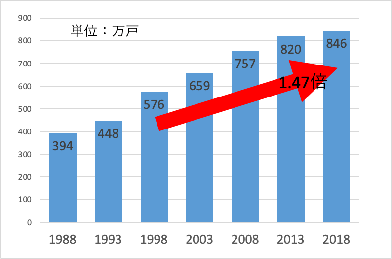 近年の日本では、少子高齢化や都市部への人口集中などが要因となった地方の過疎化、並びに空き家の増加が社会問題となっています。国土交通省の調査によると、この20年間で、空き家の総数は576万戸から846万へと約1.47倍に増加しています。