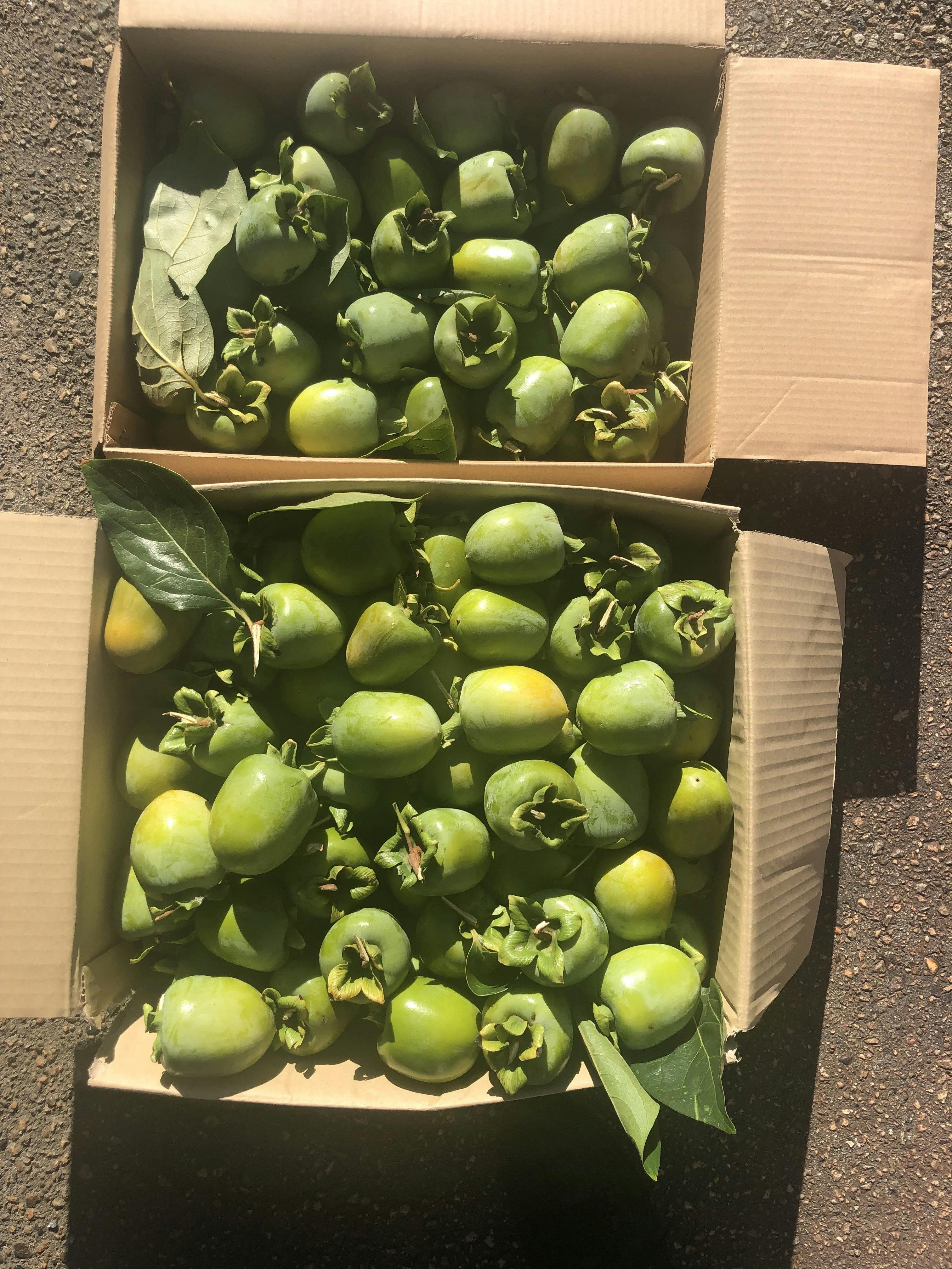 富山県、南砺市の農家の方から頂いた青柿10kgを使って柿渋塗料を製作中です。