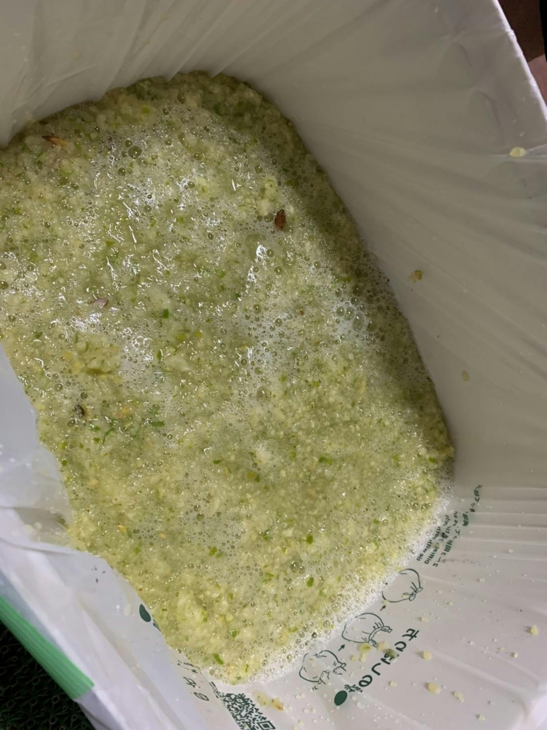青柿をミキサーなどで細かく砕き、水に浸して3日ほど寝かせた後に、木綿の布を使って絞りました。