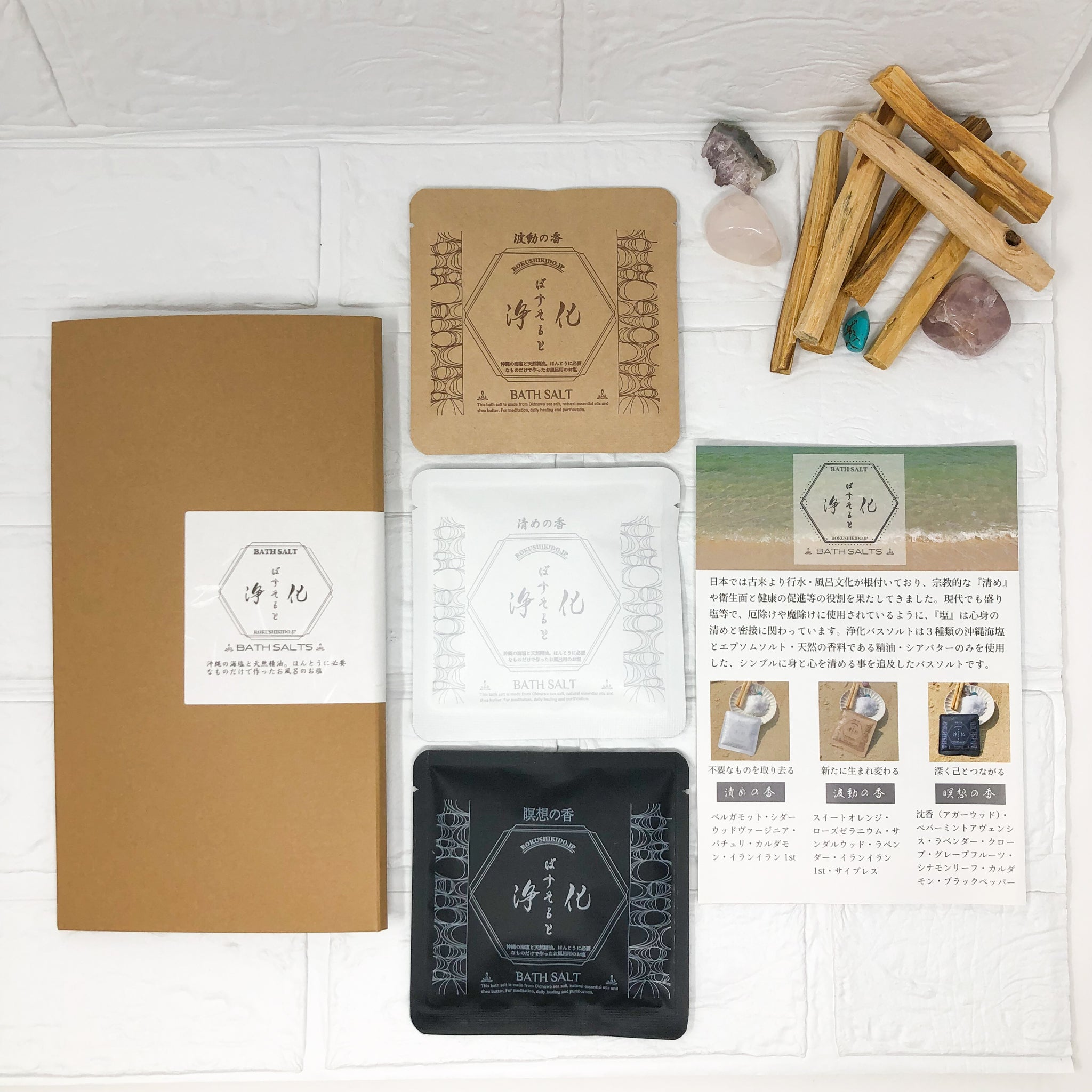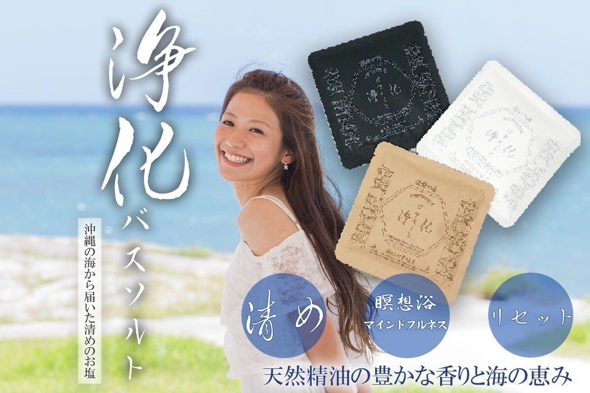 浄化バスソルトはミネラルたっぷり沖縄の自然のエネルギーを感じる3種類の海塩、エプソムソルト・天然の香料である精油・シアバターのみを使用した、シンプルに身と心を清める事を追及したバスソルトです。