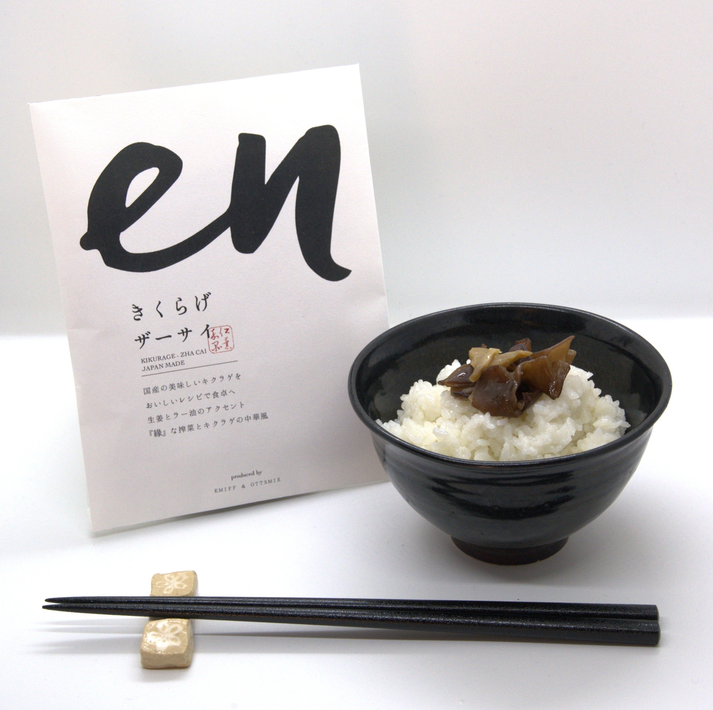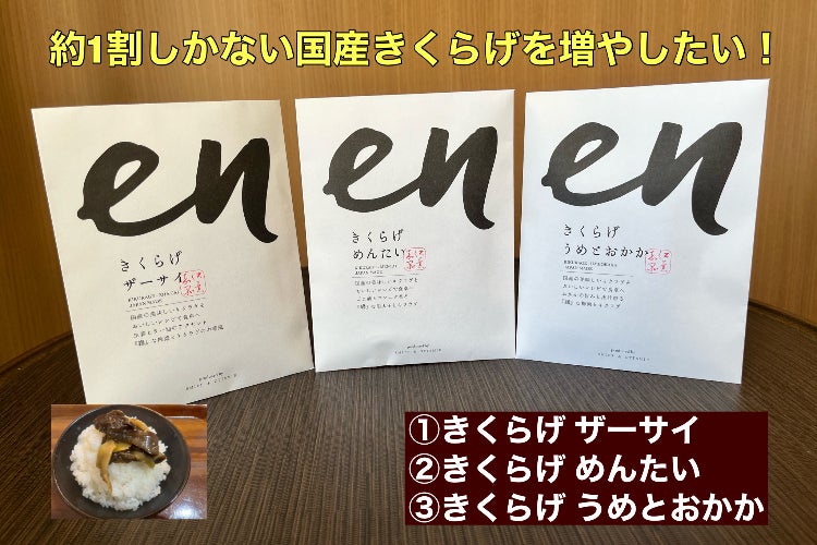しかし調べてみますときくらげを使用したレシピは限られており、きくらげとの接触率を高める消費が先決ではないかと判断し、手軽な【en】きくらげご飯のお供を企画製造しました。